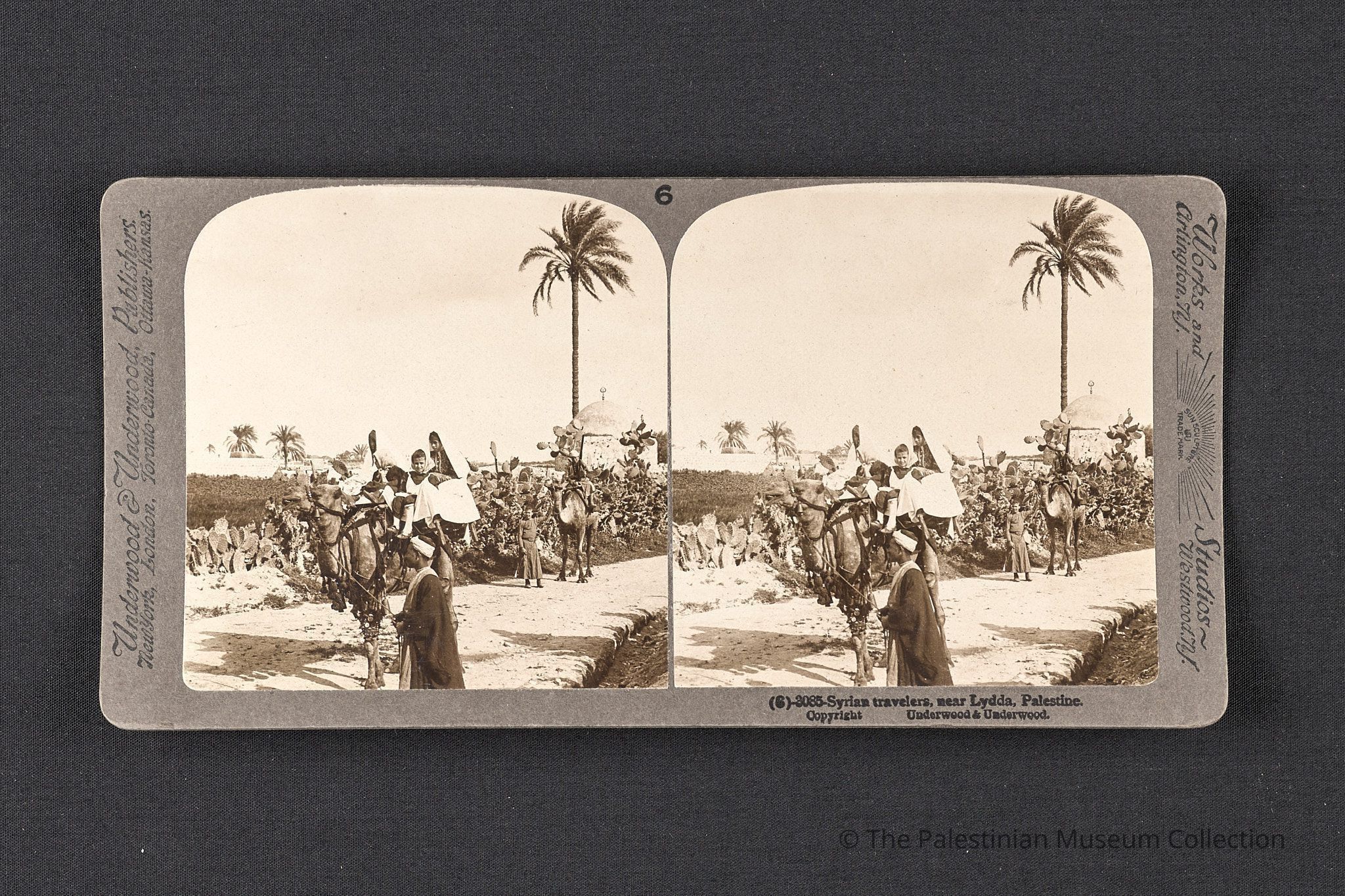 صورة فوتوغرافيّة بالأبيض والأسود، التقطتها شركة أندروود آند أندروود في أوائل القرن العشرين، تُظهر مسافرين سوريين على الجمال بقرب اللد.