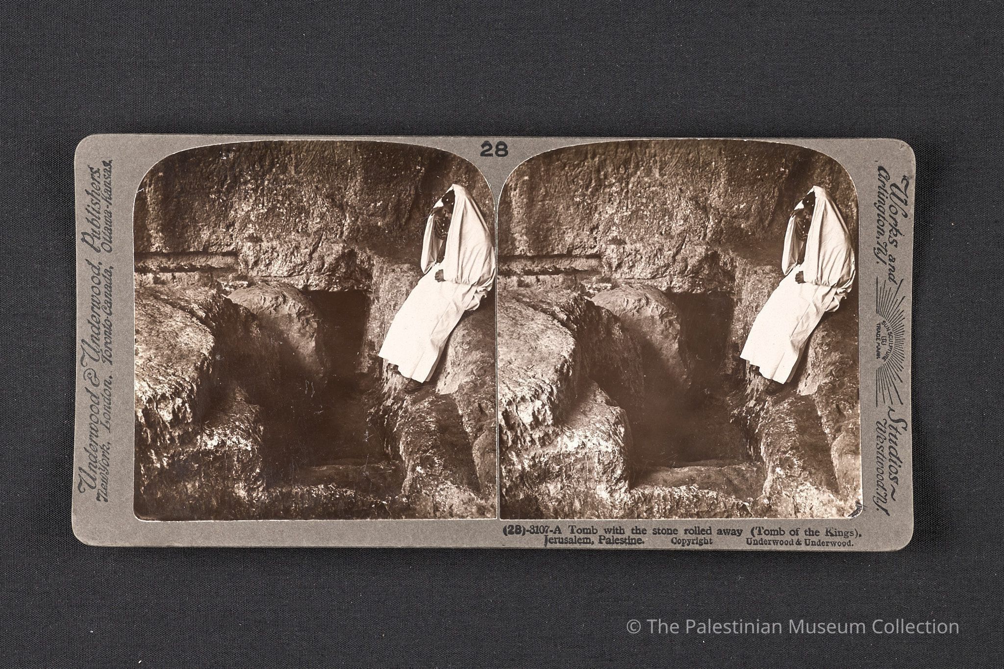 A black-and-white photograph taken by Underwood & Underwood in the early twentieth century, depicting the Tomb of the Kings with a stone rolled away in Jerusalem, with a girl dressed in white visible in the scene.Made/Created