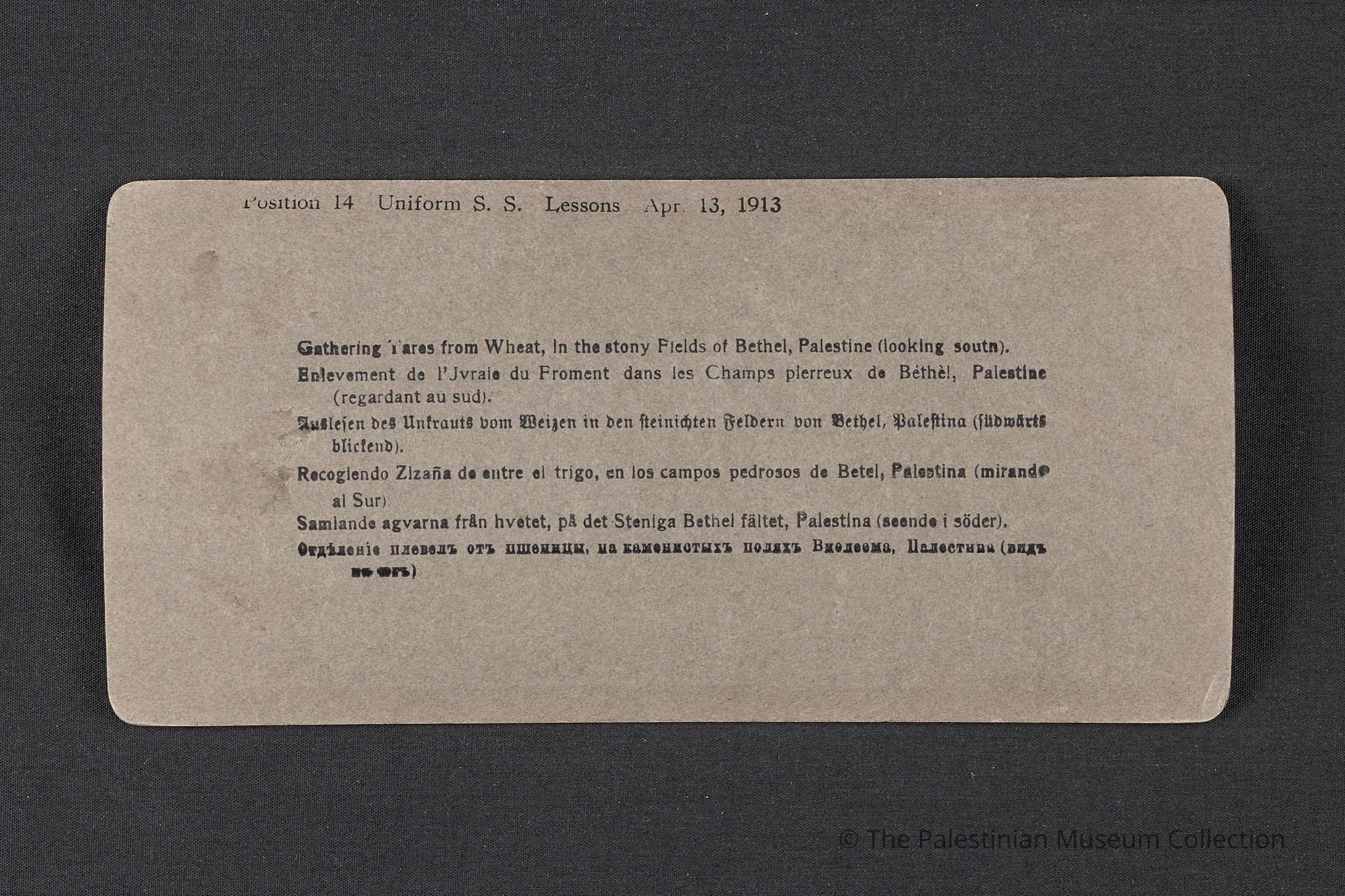 صورة لنساء ورجال يحصدون القمح في أرض تابعة لبلدة البيرة، وقد ورد في الصورة اسم بيت إيل