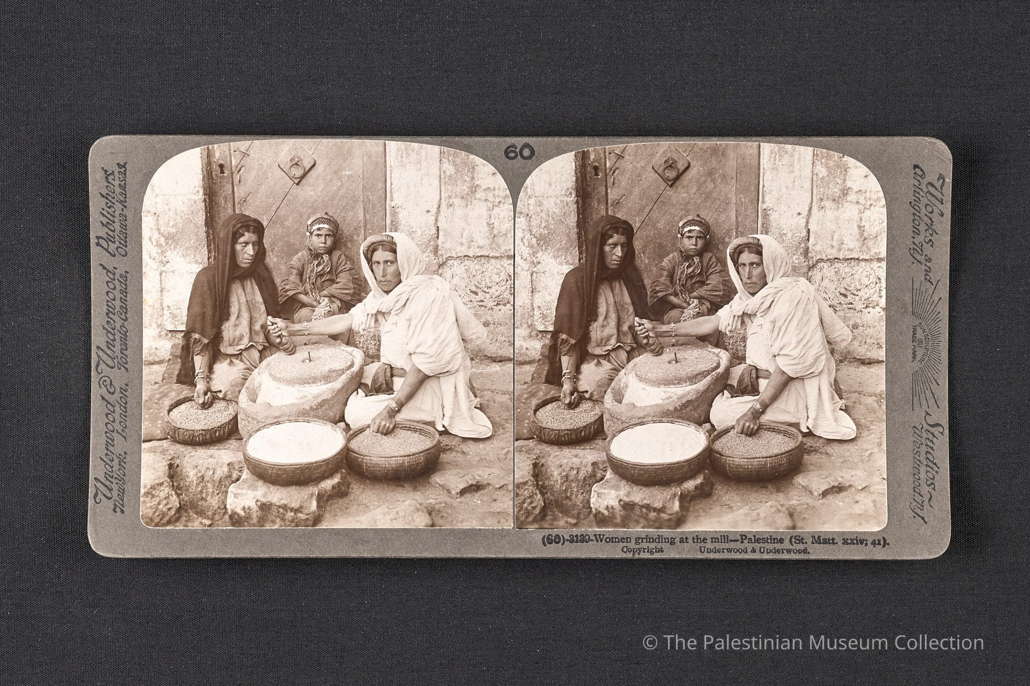 صورة فوتوغرافية بالأبيض والأسود التقطتها شركة أندروود آند أندروود في أوائل القرن العشرين، تُظهر امرأتين تطحنان الحبوب في المطحنة ومعهم وطفلة.