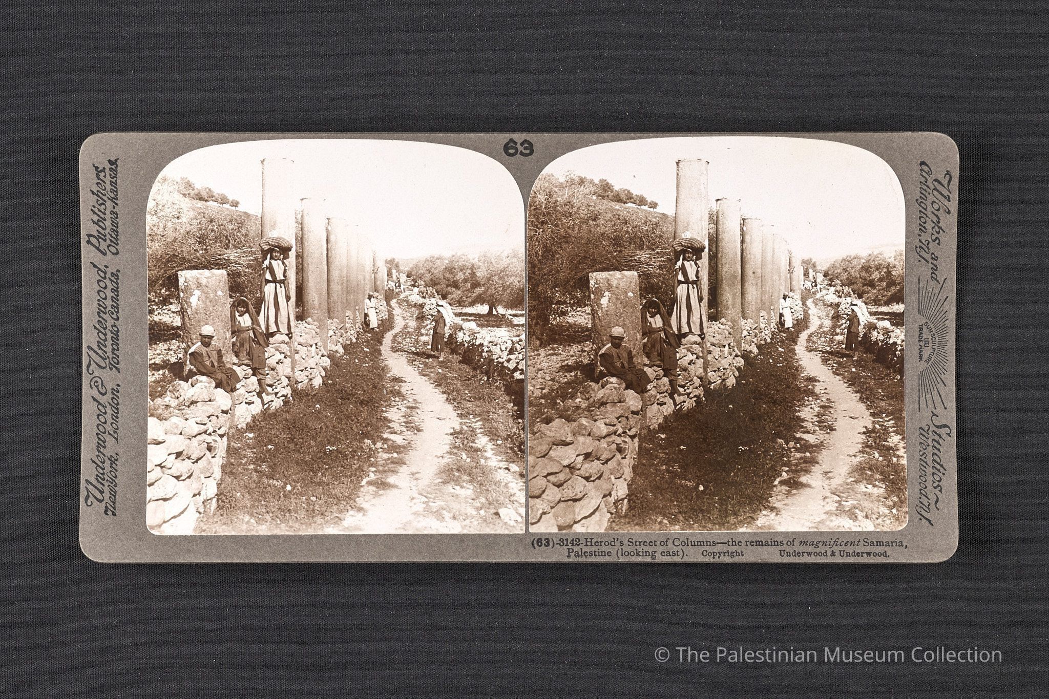 صورة فوتوغرافيّة بالأبيض والأسود، التقطتها شركة اندروود آند اندروود في أوائل القرن العشرين، تُظهر شارع هيرودس حيث بقايا سامرة في فلسطين. يظهر في الصورة السكان المحليين بالقرب من الأطلال