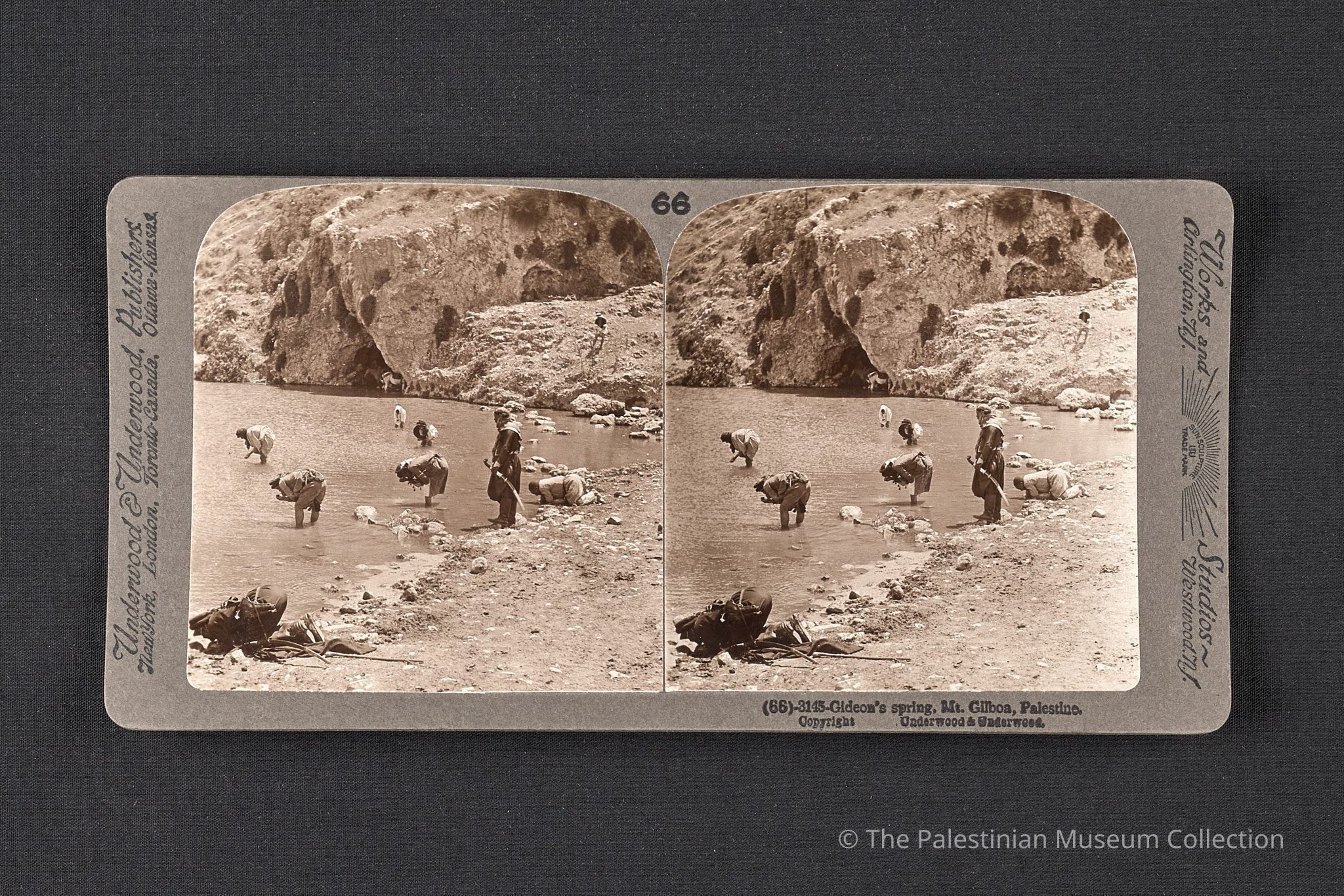 صورة فوتوغرافيّة بالأبيض والأسود التقطتها شركة أندروود آند أندروود في أوائل القرن العشرين، تُظهر أشخاصًا وهم يشربون من نبع جدعون عند أقدام جبل جلبوع في فلسطين