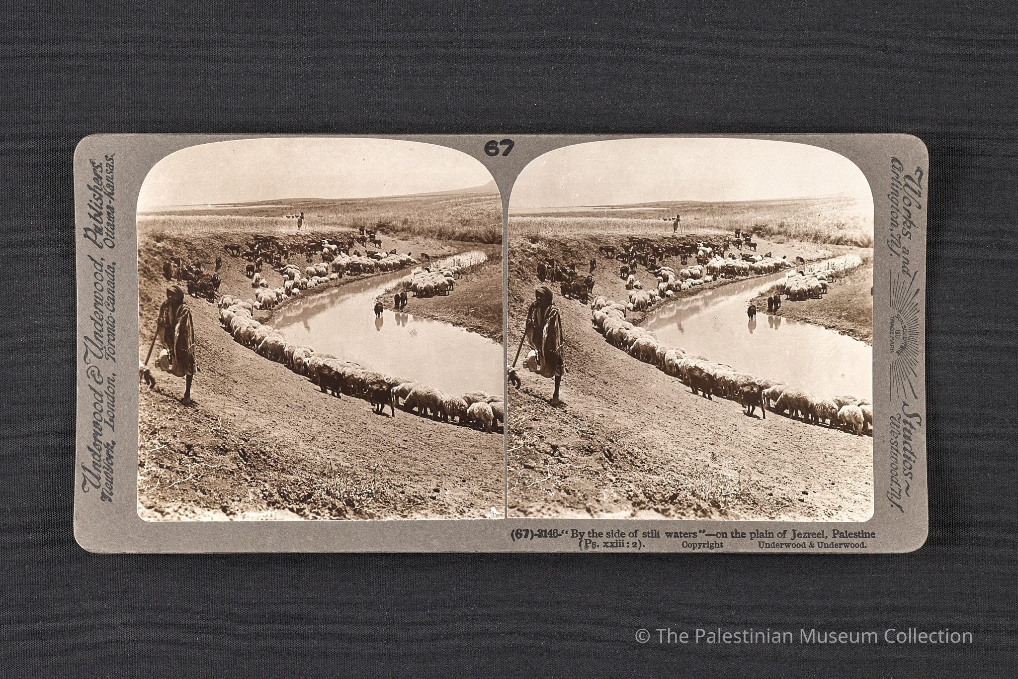 A black-and-white photograph taken by Underwood & Underwood in the early twentieth century. It features shepherds and livestock by the still waters in the Valley of Marj Ibn Amer in Palestine.Made/Created