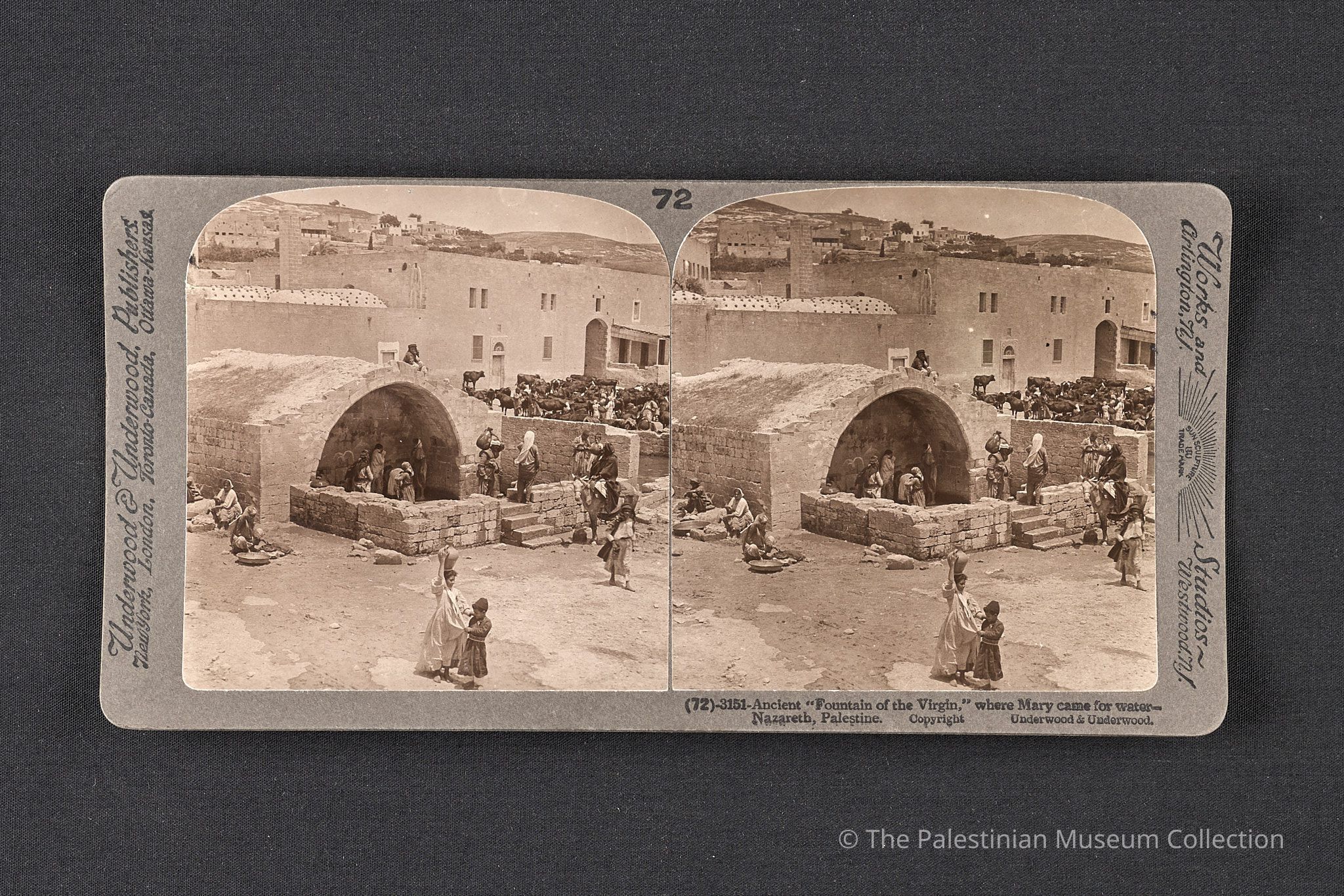 صورة فوتوغرافيّة بالأبيض والأسود، التقطتها شركة أندروود آند أندروود في أوائل القرن العشرين، تُظهر عين العذراء أو بئر مريم حيث كانت تستقي مريم العذراء الماء في الناصرة. في المقدمة، تظهر نساء محليات يحملن الجرار على رؤوسهن لجلب الماء من النبع.