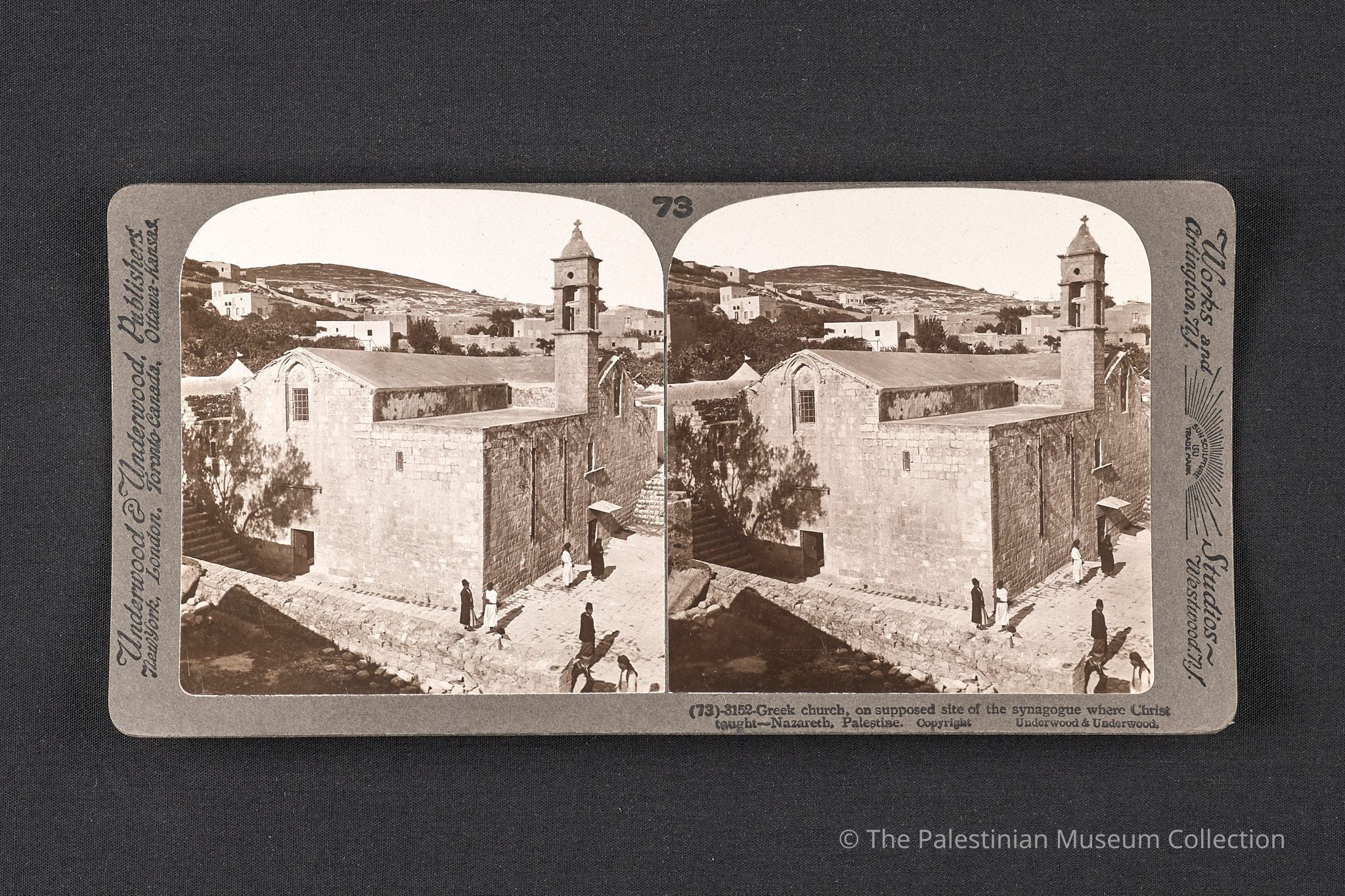 صورة فوتوغرافيّة بالأبيض والأسود، التقطتها شركة أندروود آند أندروود في أوائل القرن العشرين، تُظهر الكنيسة الأرثوذكسية اليونانية في الموقع المفترض للكنيس الذي علم فيه المسيح في الناصرة.