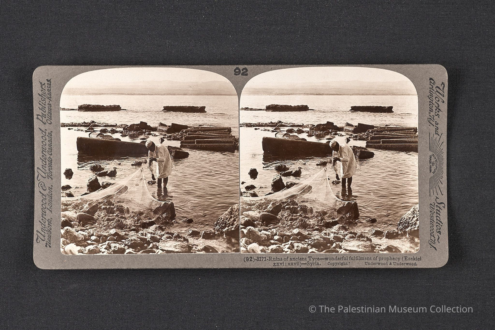 A black-and-white photograph taken by the Underwood & Underwood in the early twentieth century. It features the ruins of ancient Tyre, with a fisherman visible in the scene.Made/Created