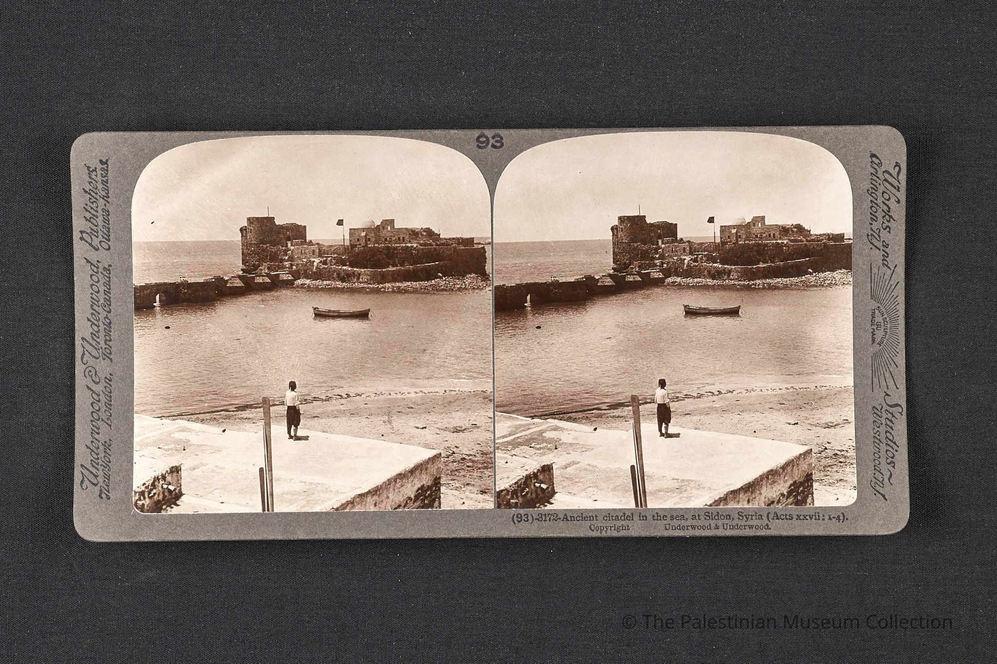 الباعة والمشترين A black-and-white photograph taken by Underwood & Underwood in the early 20th century. It depicts an ancient citadel in the sea at Sidon, Syria.Made/Created