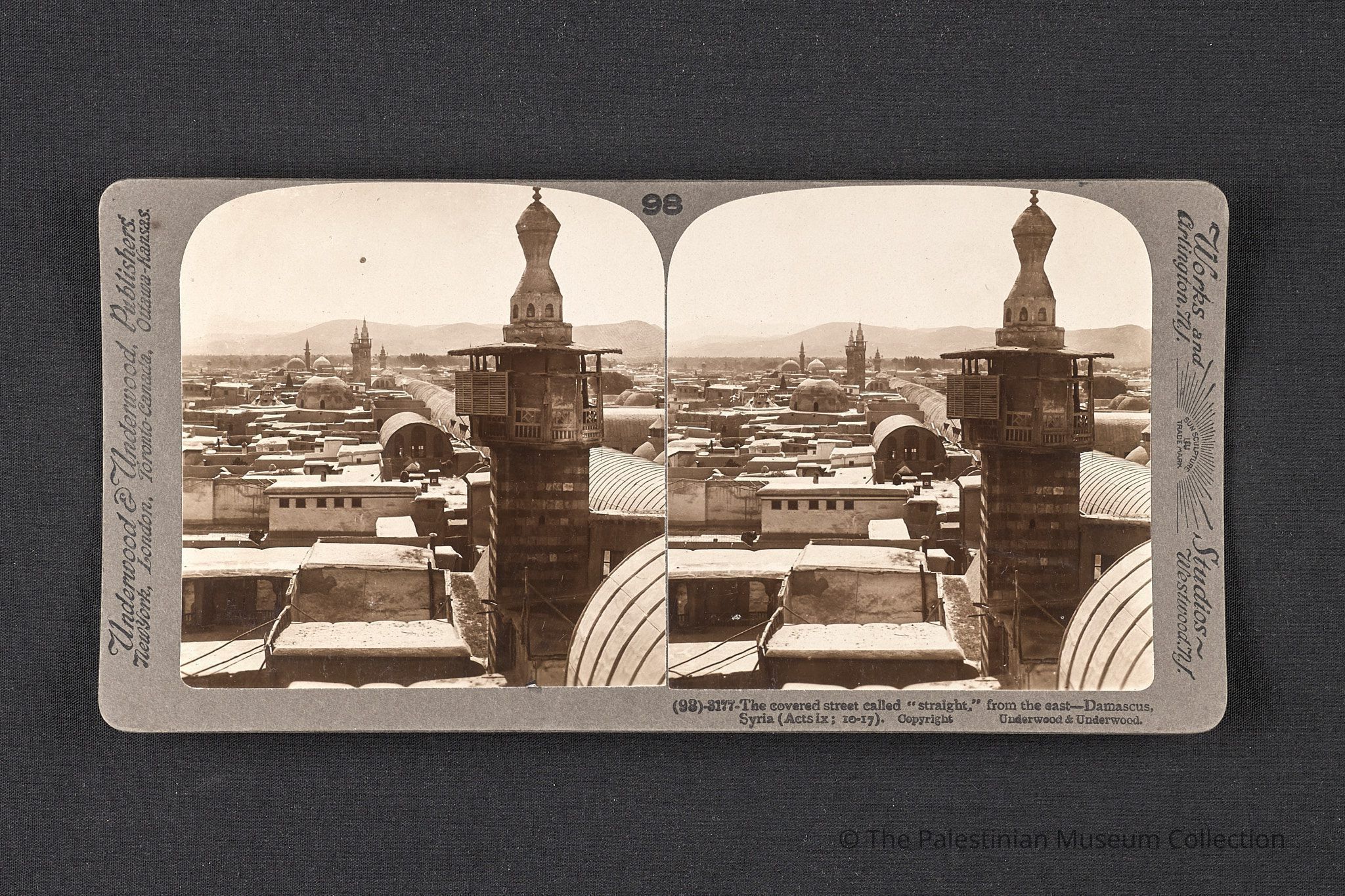 A black-and-white photograph taken by Underwood & Underwood in the early 20th century. It depicts the Straight Street in Damascus, Syria. The image features mosque minarets and an urban scene.Made/Created