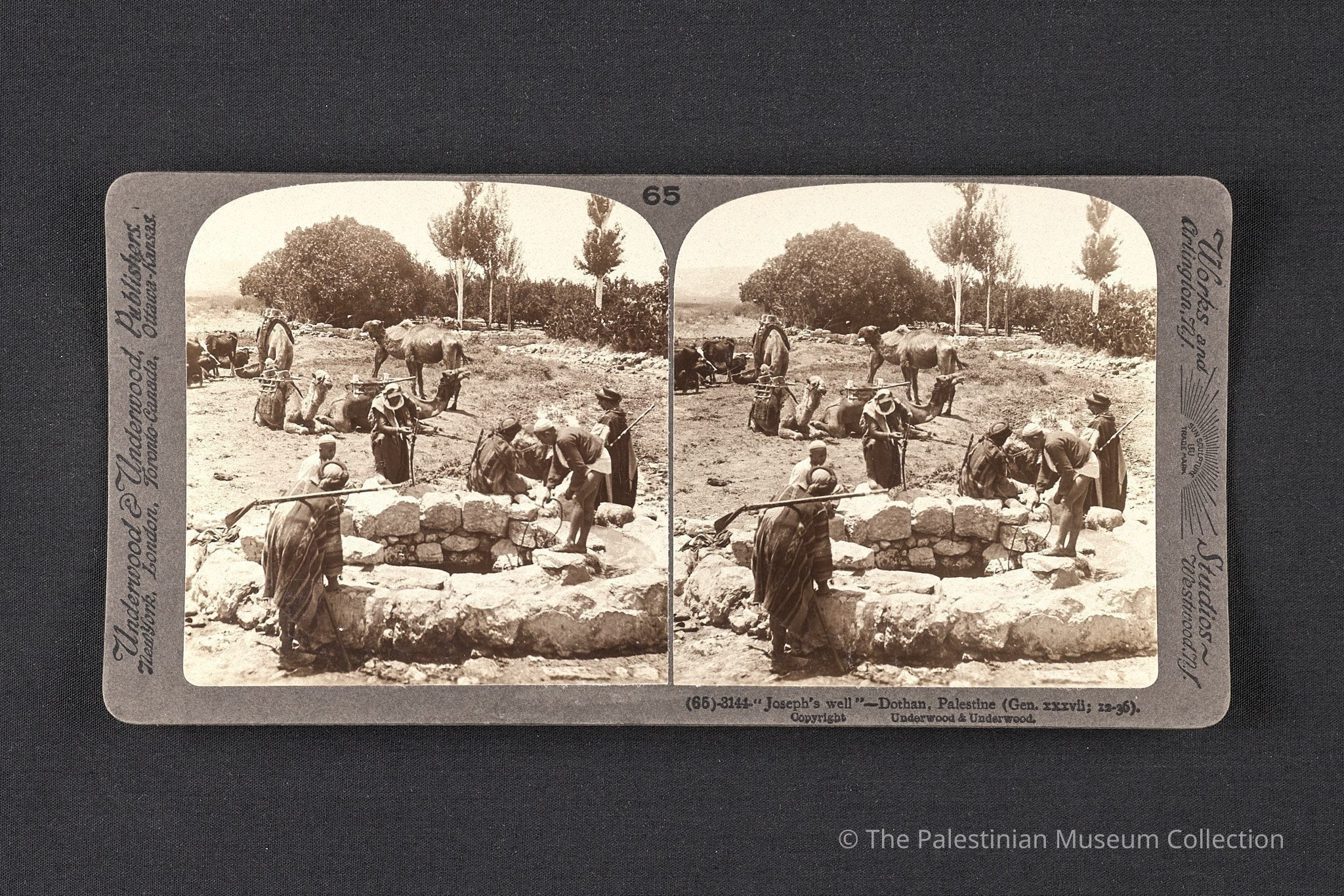 Black-and-white photograph taken by Underwood & Underwood in the early twentieth century, showing locals and camels at Joseph’s Well in Tell Dothan in Palestine.Made/Created