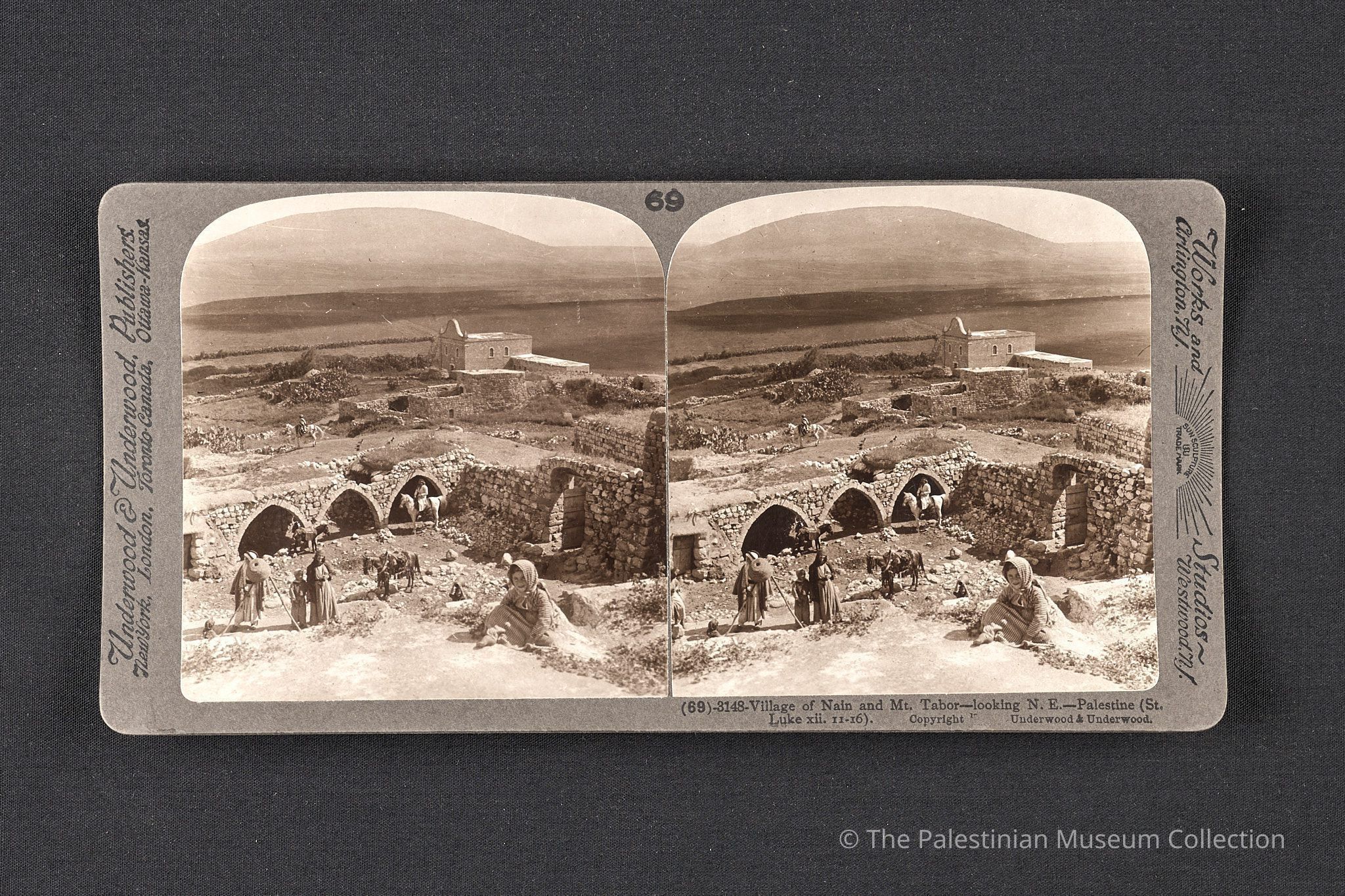 صورة فوتوغرافيّة بالأبيض والأسود، التقطتها شركة أندروود آند أندروود في أوائل القرن العشرين، تُظهر قرية نين في الناصرة وجبل طابور في الجليل من الجهة الشماليّة الشرقيّة، ويظهر في الصورة نساءٌ ورجالٌ وبغالٌ.