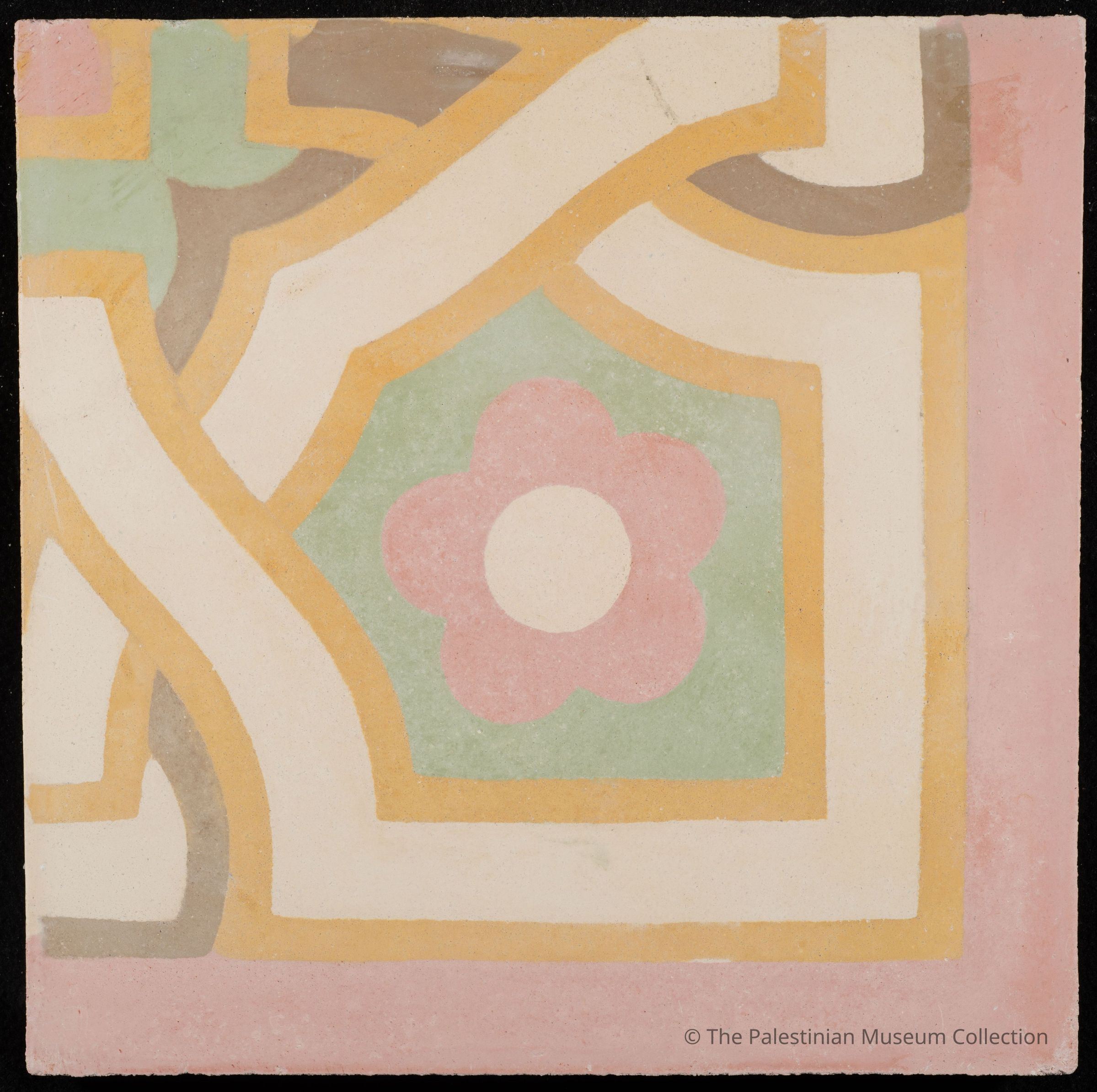 بلاطة إسمنتيّة ملوّنة بحجم 20 × 20 سم، تحمل تصميم "زاوية زنار السكبة"، وهي نموذج حديث سُكبت في قالب يمتلكه مصنع أصلان للبلاط في نابلس يعود إلى نهاية القرن التاسع عشر.