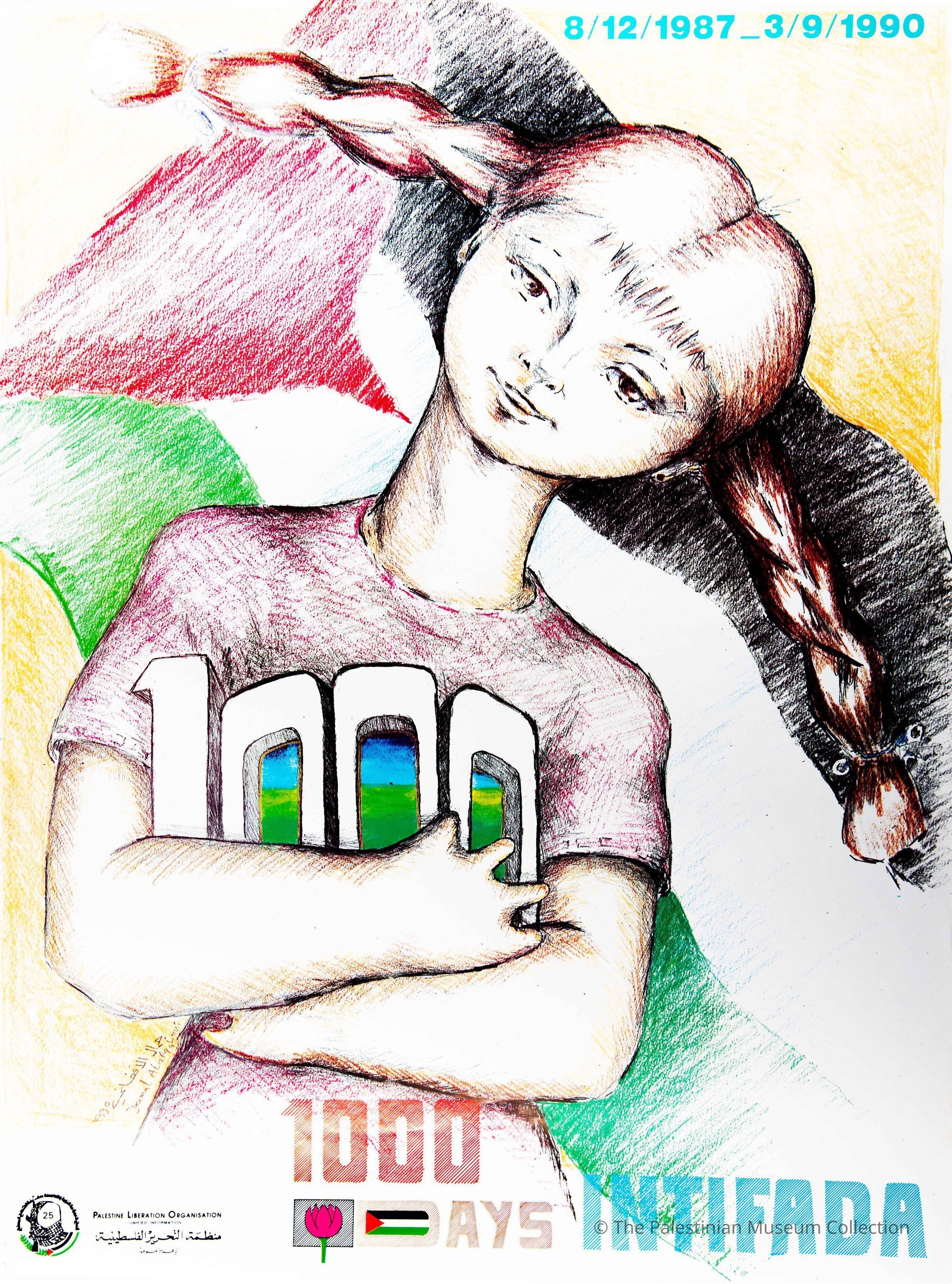 مُلصق بعنوان "1000 يوم على الانتفاضة"، صادر عن مجلس الإعلام الموحّد لمنظّمة التحرير الفلسطينيّة عام 1990، بمناسبة مرور 1000 يوم على الانتفاضة الأولى للشعب الفلسطيني. تتوفّر ضمن مجموعة المتحف نسخة أخرى من هذا المُلصق.