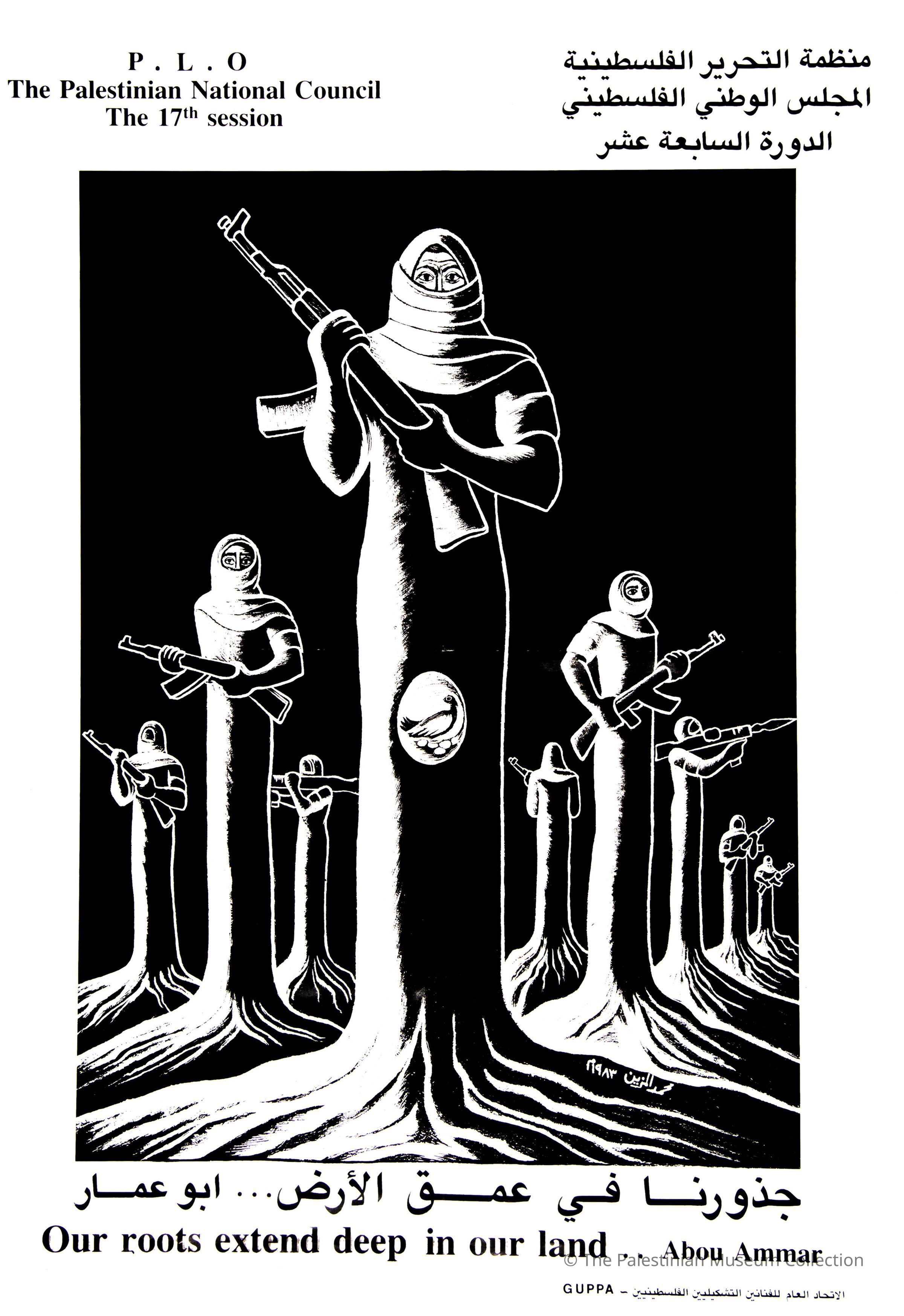 A poster entitled 'Our roots extend deep in our land' issued by the General Union of Palestinian Plastic Artists (GUPPA) in 1984 in conjunction with the 17th session of the Palestine Liberation Organisation (PLO) Palestinian National Council. It features 1983 artwork by the artist Mohammed Al Muzain.