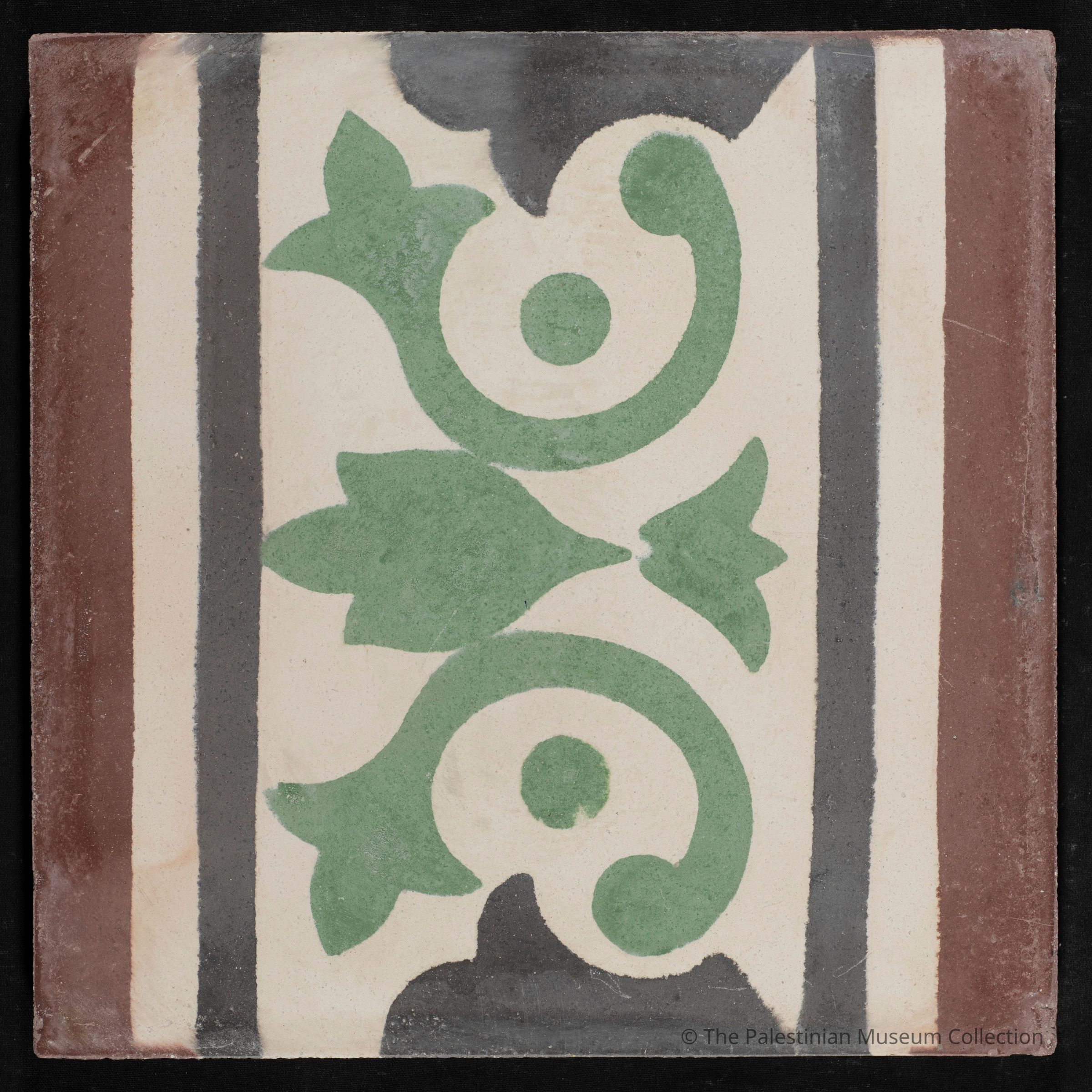 A 20 × 20 cm coloured cement Zunnar (border) tile. This tile is a contemporary reproduction, cast using an original mold from the Aslan Tile Factory in Nablus.Made/Created