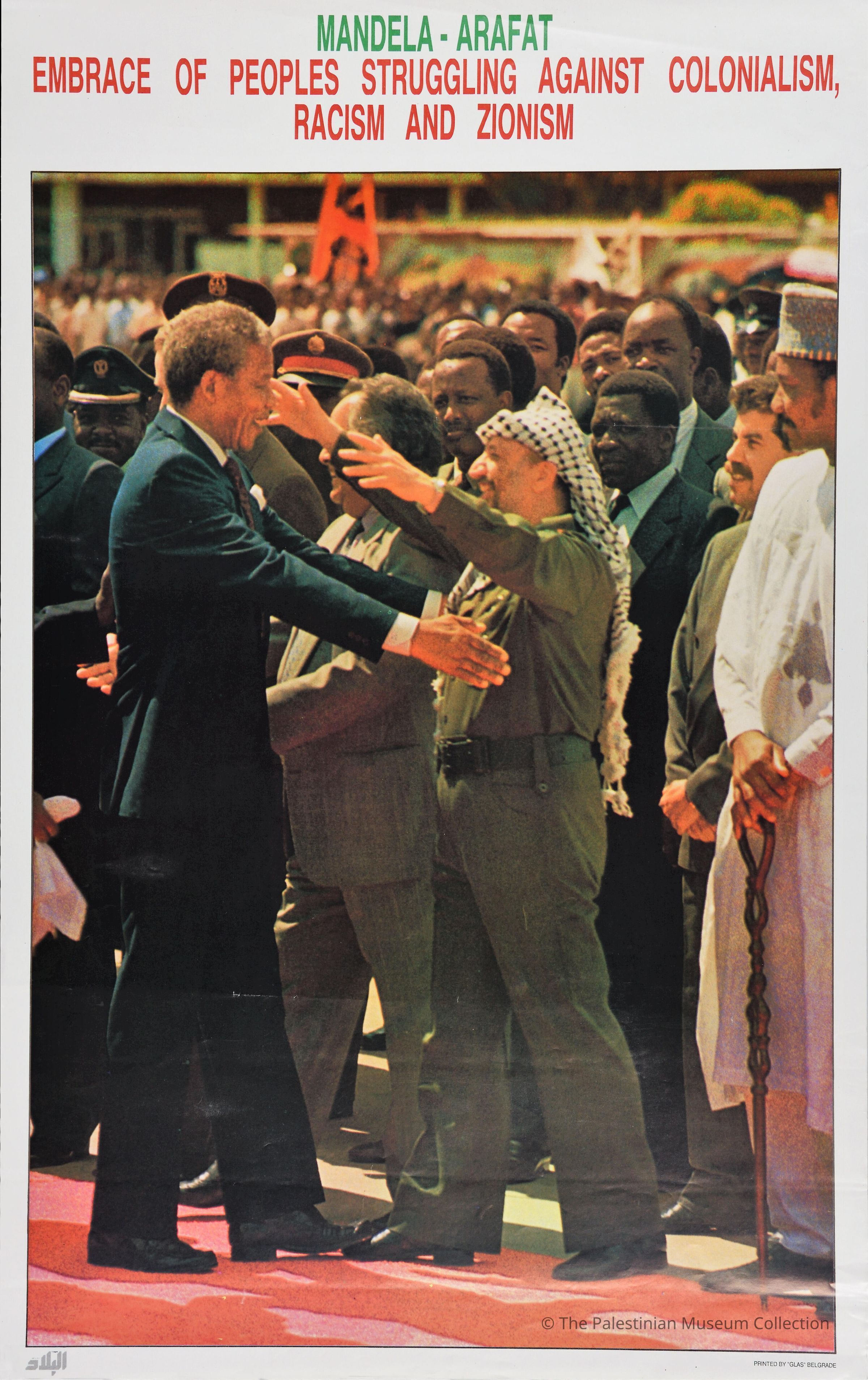 ملصق ملون، يظهر فيه عدداً من رؤساء الدول الأفريقية، يظهر ياسر عرفات ونيلسون مانديلا في لقاء ودي.