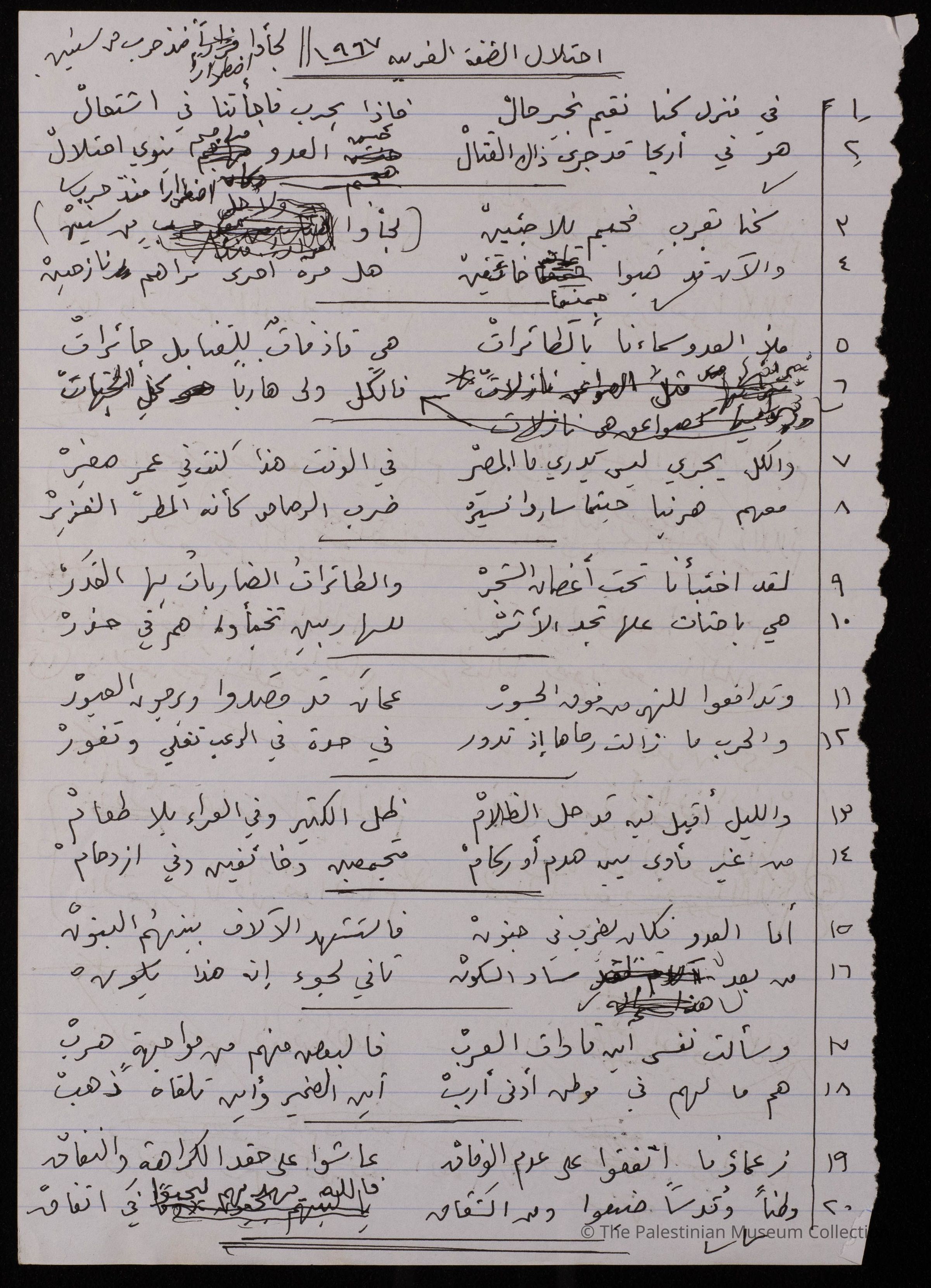 مخطوطة قصيدة باللغة العربية بعنوان" احتلال الضفة الغربية 1967"للشاعرة فطمة المحب، ولا تحمل الوثيقة اية اشارة الى تاريخ كتابتها.