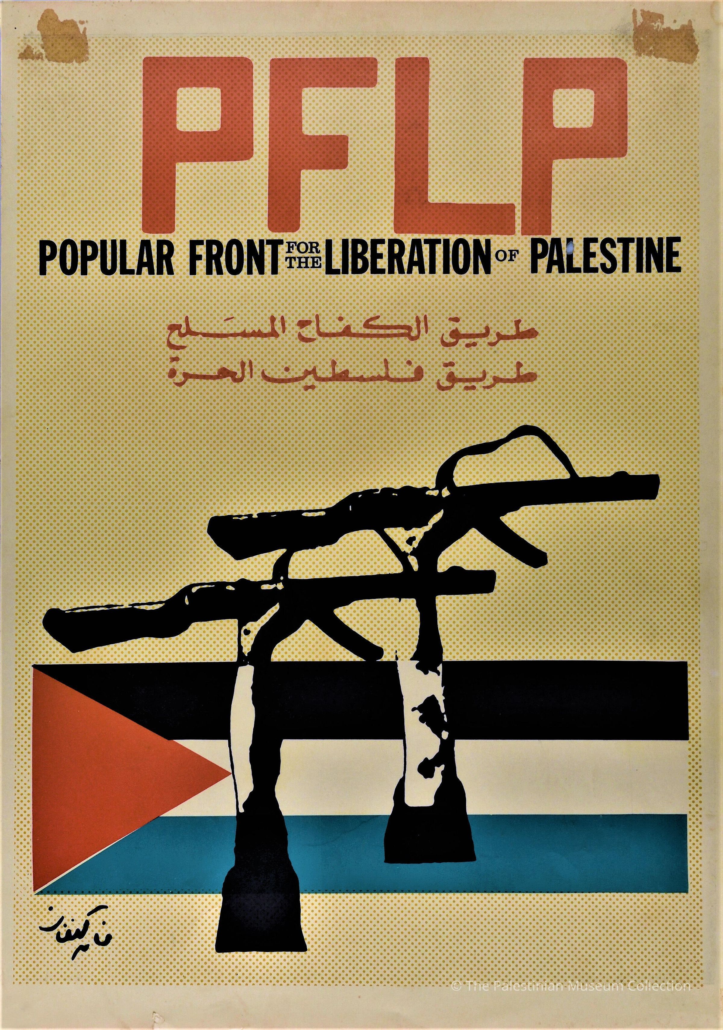 ملصق ملون، يظهر فيه أيدي ترفع البندقية الى أعلى في الخلف علم فلسطين. A colour poster showing hands holding a rifle in front of the Palestinian flag.
