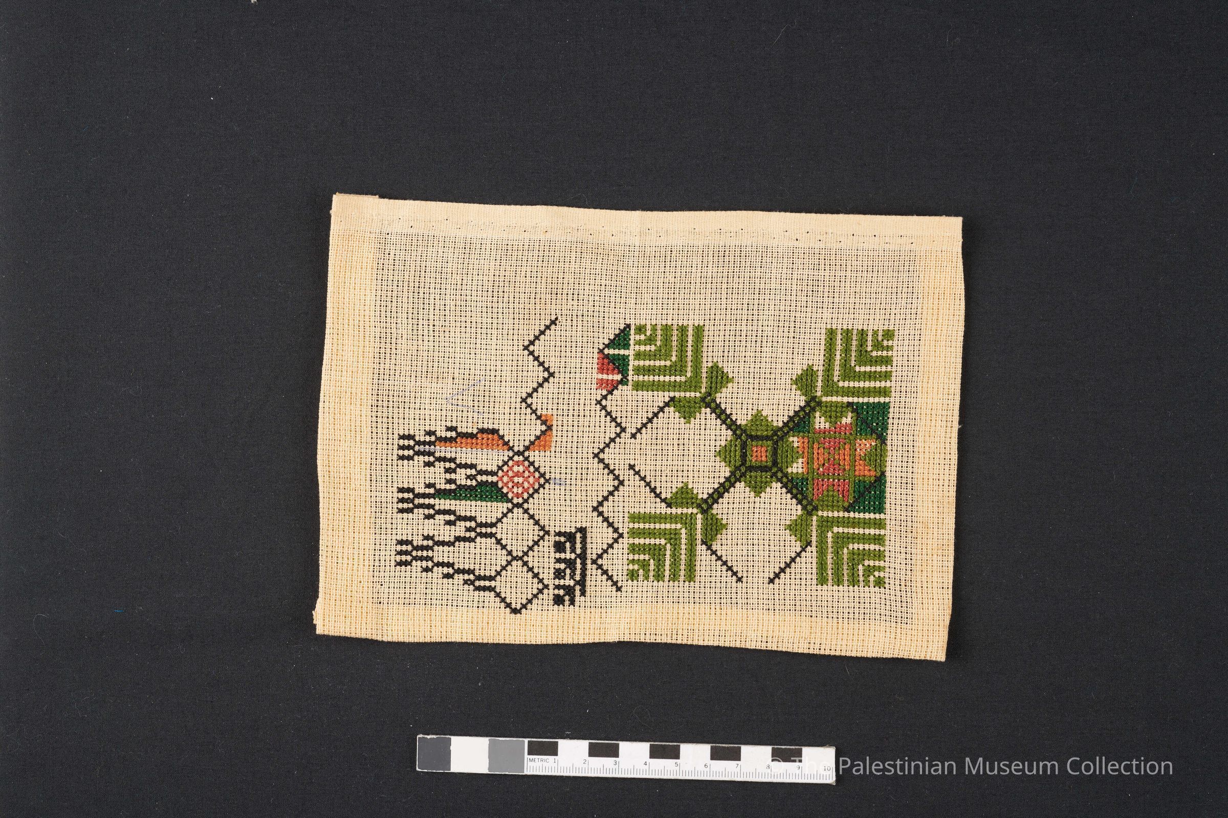 نموذج تطريز على قماش ايتامين بحرير لون اخضر درجتين واصفر واسود وبرتقالي درجتين برسمات متعددة منها السرو والريش والجبال