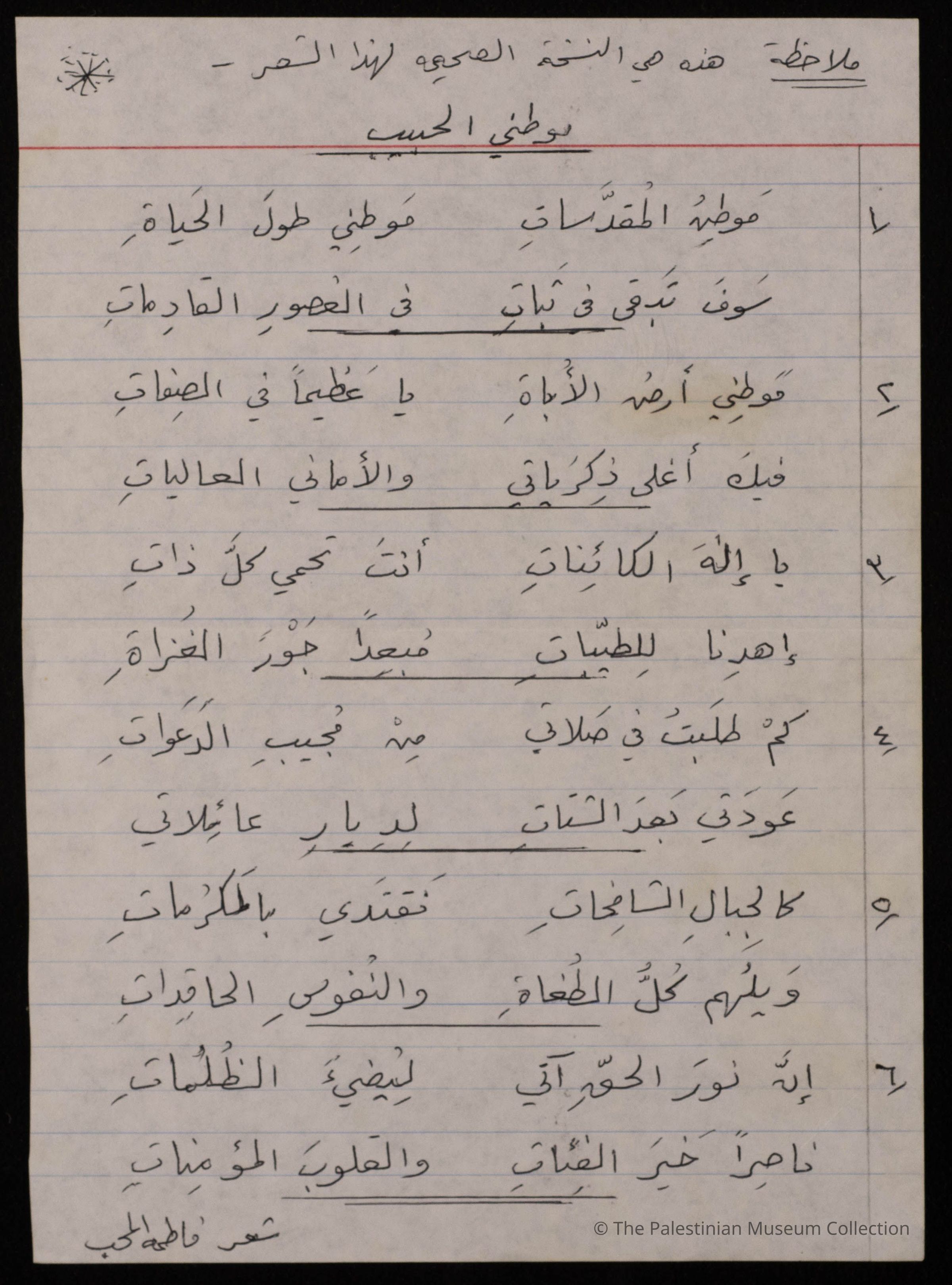 مخطوطة قصيدة باللغة العربية بعنوان" موطني الحبيب" للشاعرة فاطمة المحب، ولا تحمل الوثيقة اية اشارة الى تاريخ كتابتها