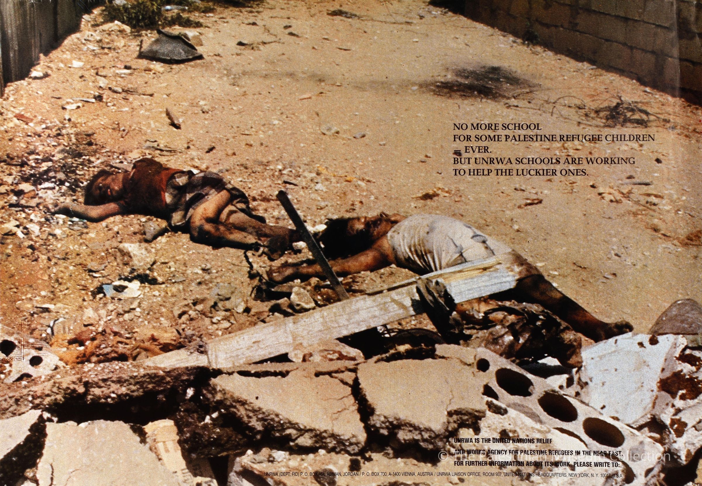 A poster, published by the United Nations Relief and Works Agency for Palestine Refugees in the Near East (UNRWA) between 1980-85, shows two Palestinian refugee children corpses which were found under the rubble of their refuge shelters. The print is captioned, "No more school for some Palestine refugee children ever. But, Unrwa schools are working to help the luckier ones."Dimensions