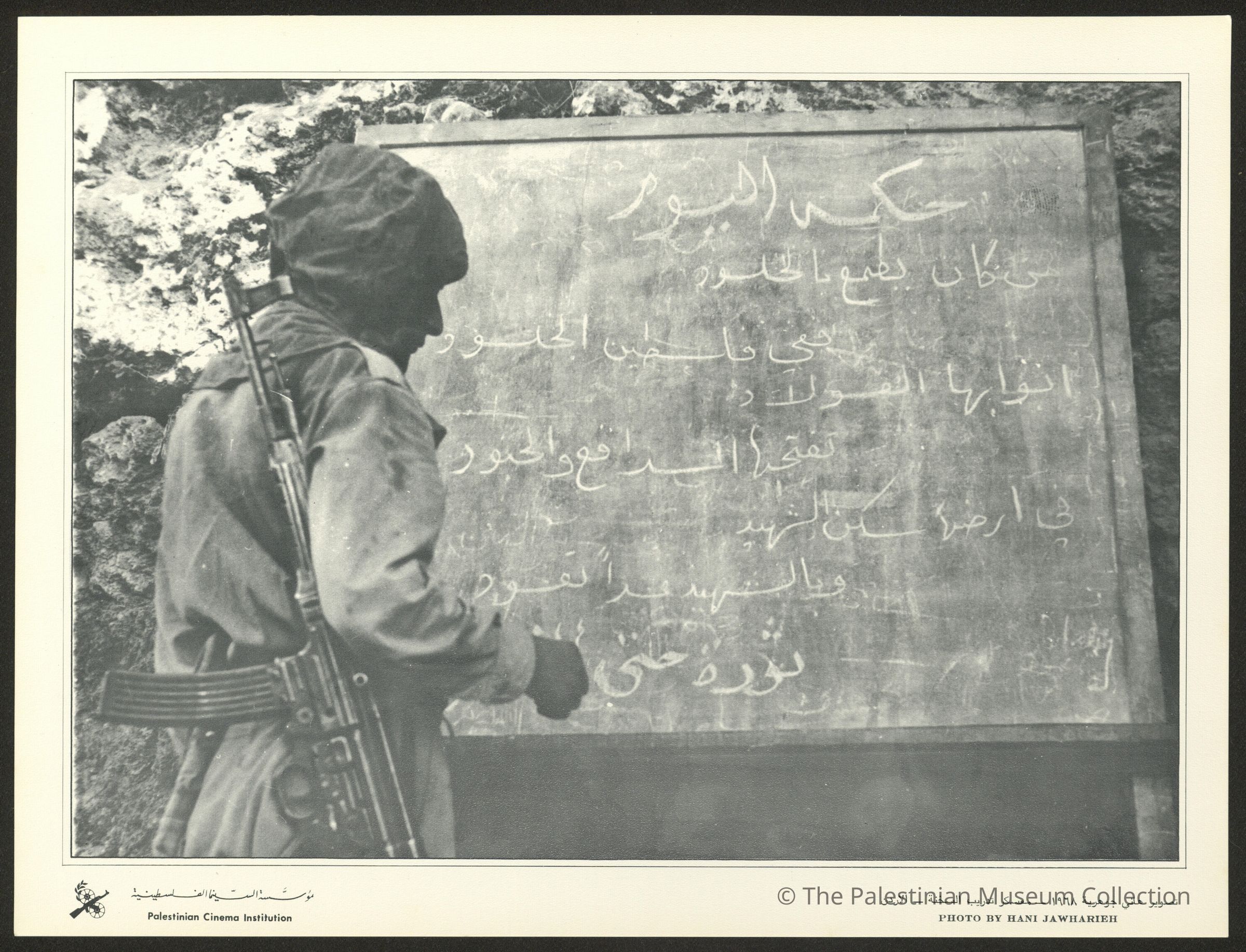 Taken by photographer Hani Jawahrieh in 1968, this black-and-white photograph shows a man carrying a rifle and writing on a board at al-Sukhna Training Camp.