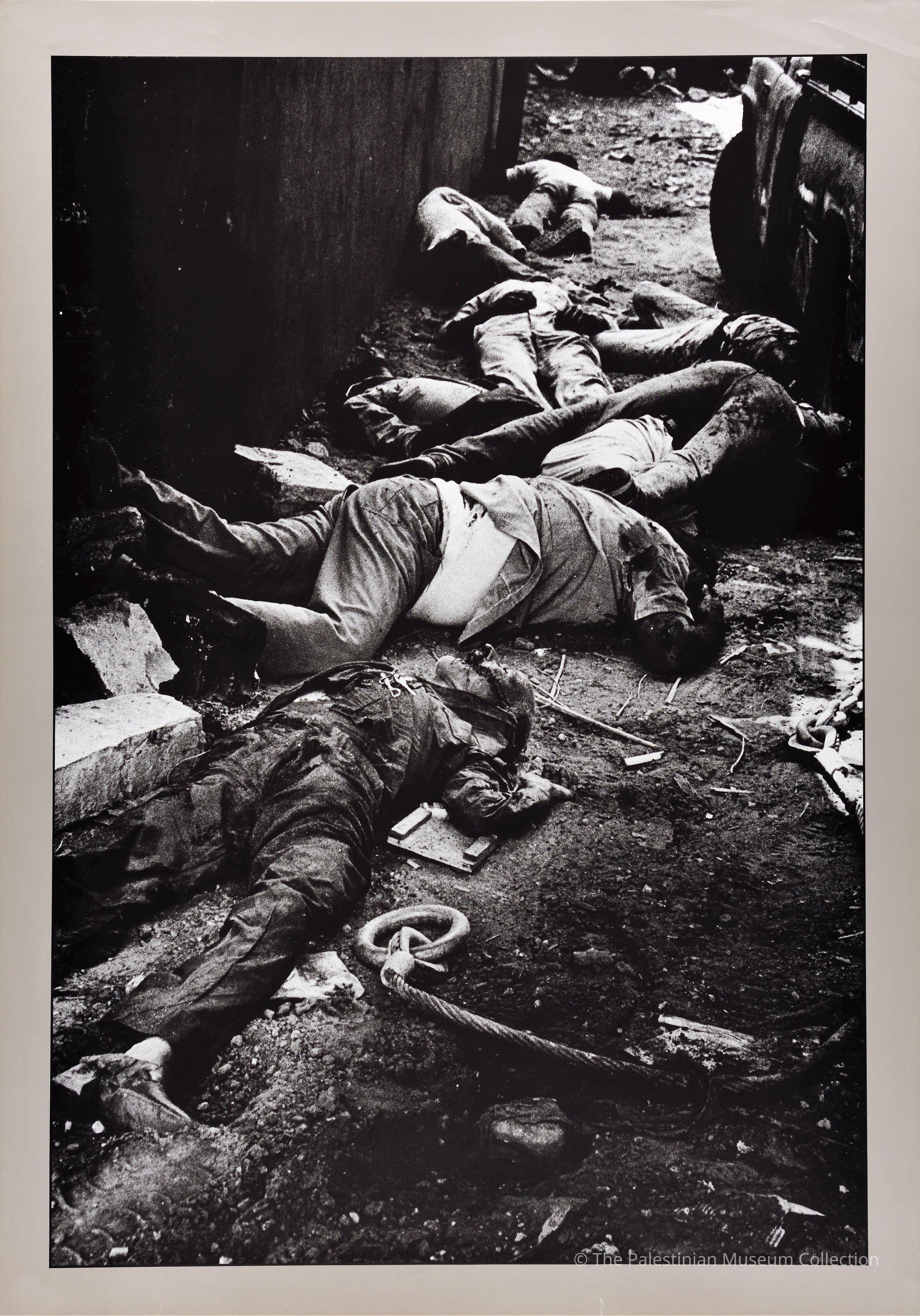 ملصق يوثق صورة لمجموعة من شهداء مجزرة صبرا وشاتيلا، 1982.