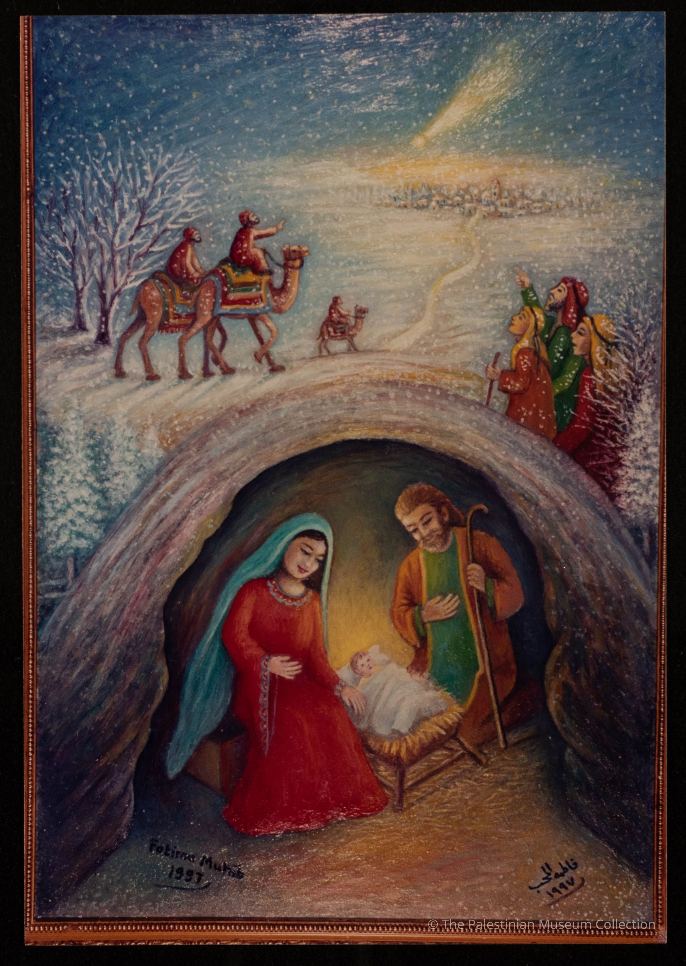 صورة عن لوحة فنية للفنانة فاطمة المحب ، يظهر فيها صورة الميلاد، رسمت عام 1997