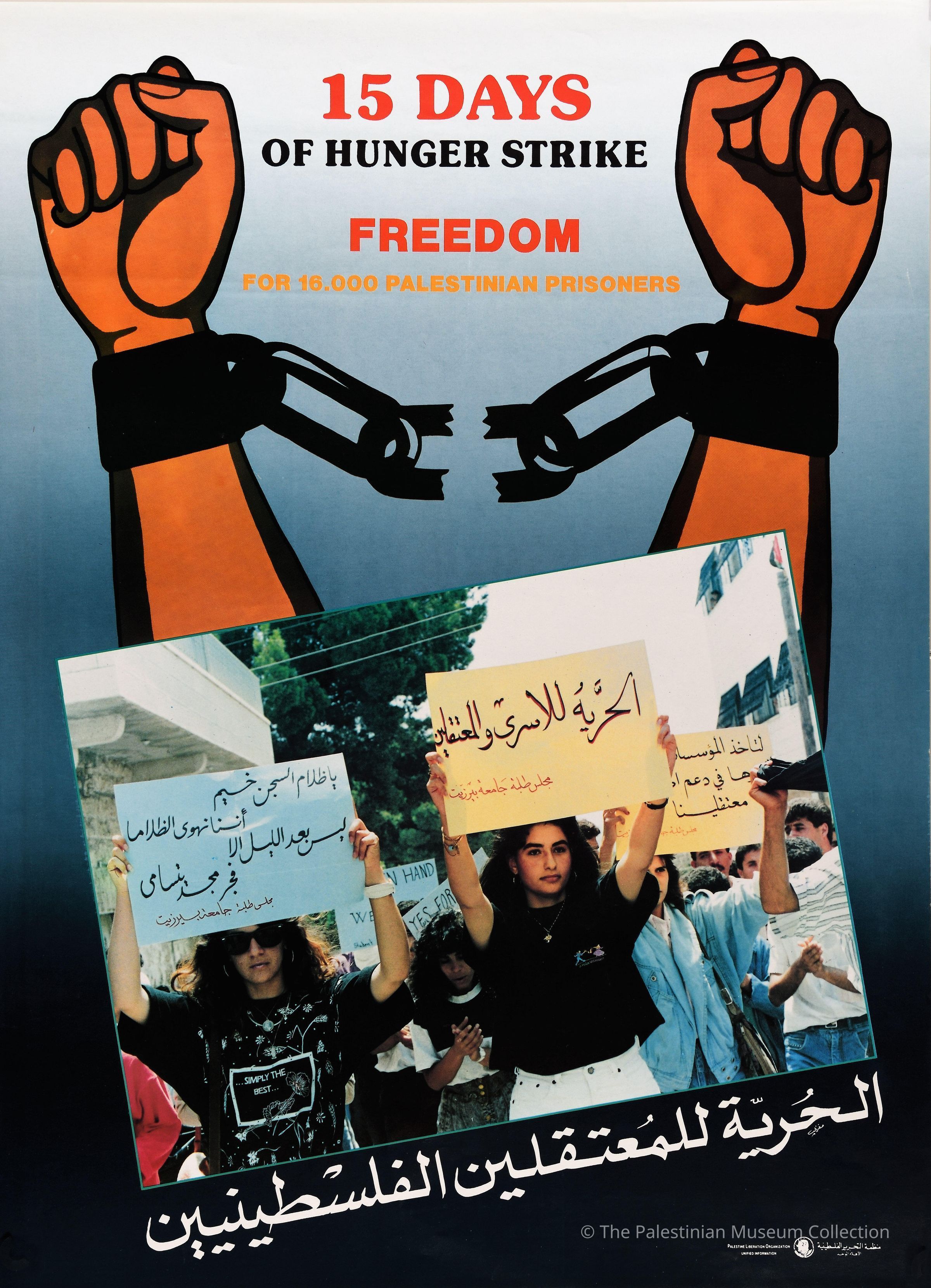 ملصق ملون، عبارة عن صورة لمظاهرة سلمية تطالب بالافراج عن الأسرى والمعتقلين الفلسطينين، يخرج من الصورة يدين قد كسرت القيد. رسم اليدين المرفوعة مع القيود المكسورة مأخوذة من ملصق آخر للفنان مارك رودين.