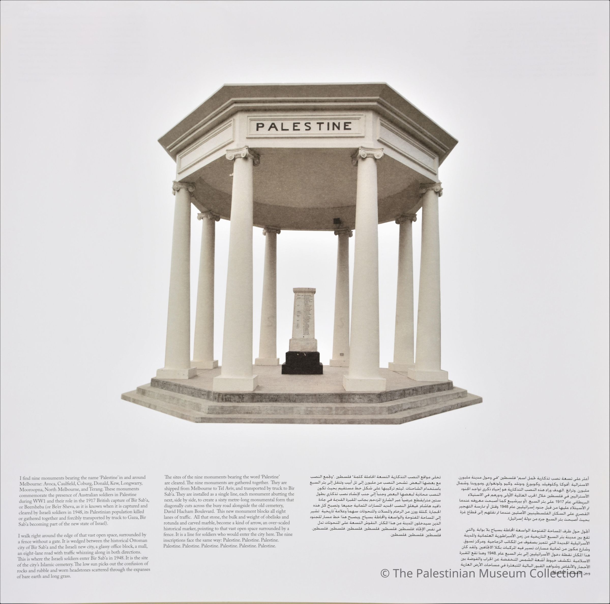 Proposition for a monument, articulated as two-sided off-set printed poster, each 50 × 50 cm, for visitors to take away, and also pasted up around Ramallah, this colour poster shows a monument commemorating the presence of Australian soldiers in Palestine during World War I and their role in the 1917 British capture of Beʾr as-Sabeʿ.