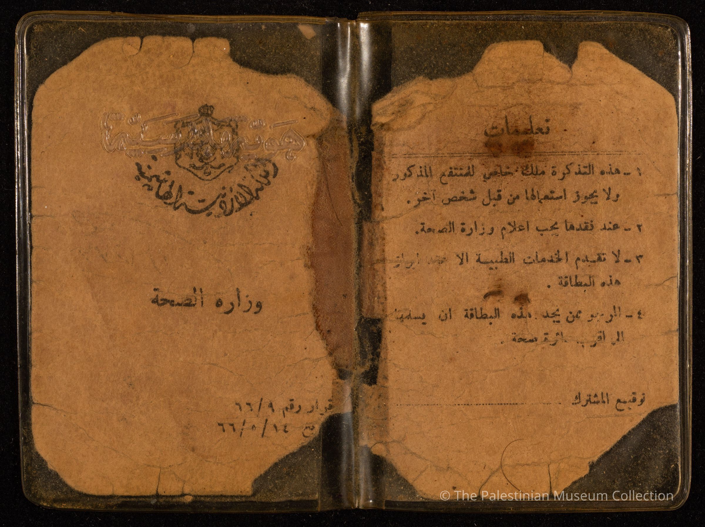 بطاقة من وزارة الصحة،تحتوي على معلومات المشترك علي فودة وعلى صورة شخصية غير ملونة وتعليمات خاصة بالبطاقة.