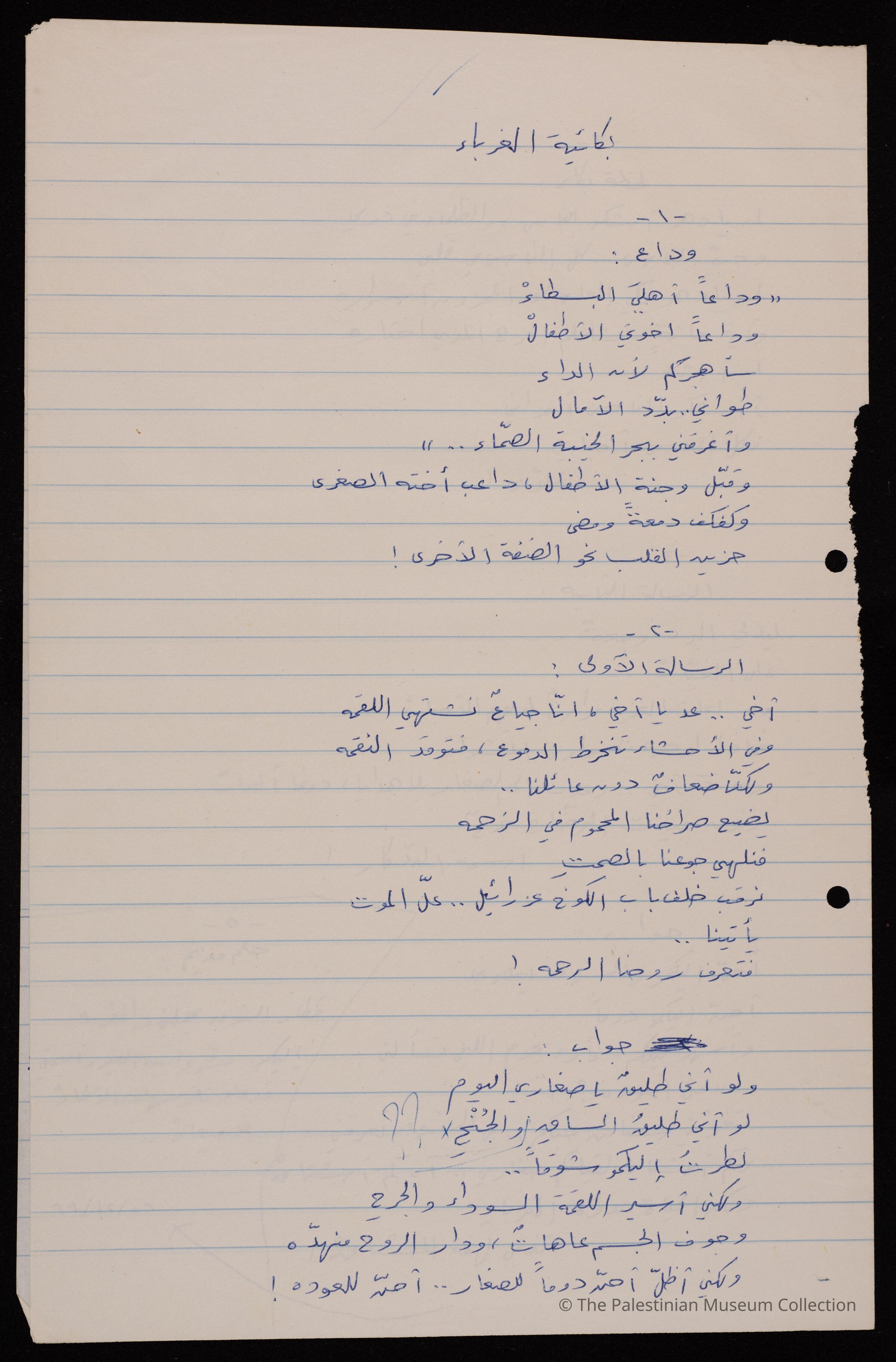 قصيدة بكائية الغرباء، تحتوي على مقاطع من النثر عن الحب، كتبت بخط يد الشاعر علي فودة.