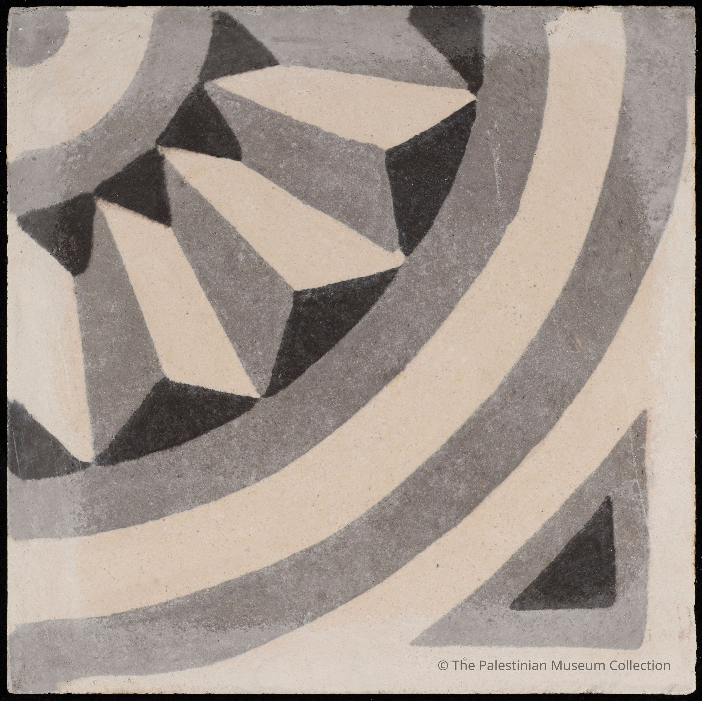 بلاطة إسمنتيّة ملوّنة بحجم 20 × 20 سم، تحمل تصميم "زاوية زنار البقلاوة"، وهي نموذج حديث سُكبت في قالب يمتلكه مصنع أصلان للبلاط في نابلس يعود إلى عشرينيّات القرن العشرين.