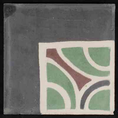 A 20 × 20 cm coloured cement tile featuring the "Watermelon Border (Zunnar) Corner" design. This tile is a contemporary reproduction, cast using a mold owned by the Aslan Tile Factory in Nablus, which dates back to the 1920s.Made/Created