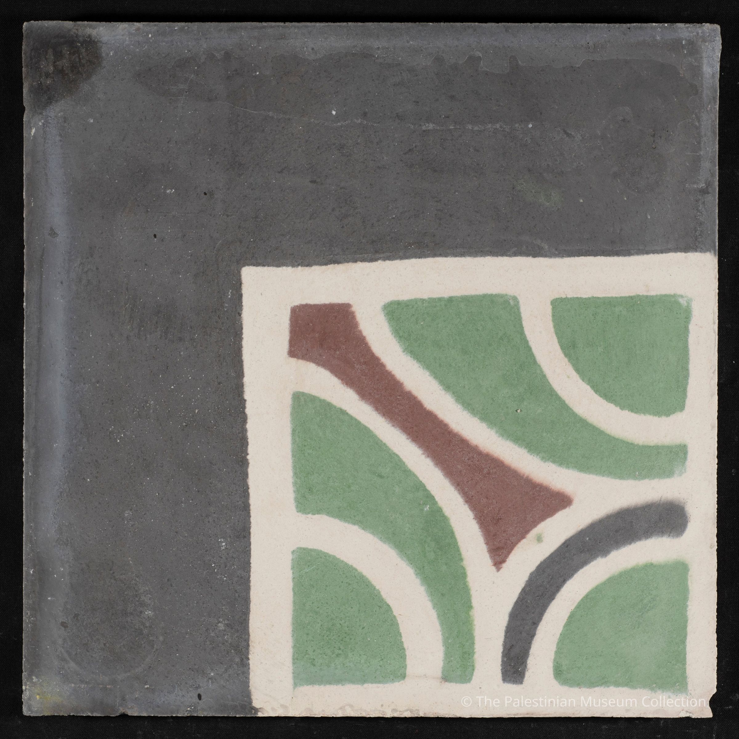 بلاطة إسمنتيّة ملوّنة بحجم 20 × 20 سم، تحمل تصميم "زاوية زنار البطيخة"، وهي نموذج حديث سُكبت في قالب يمتلكه مصنع أصلان للبلاط في نابلس يعود إلى عشرينيات القرن العشرين.