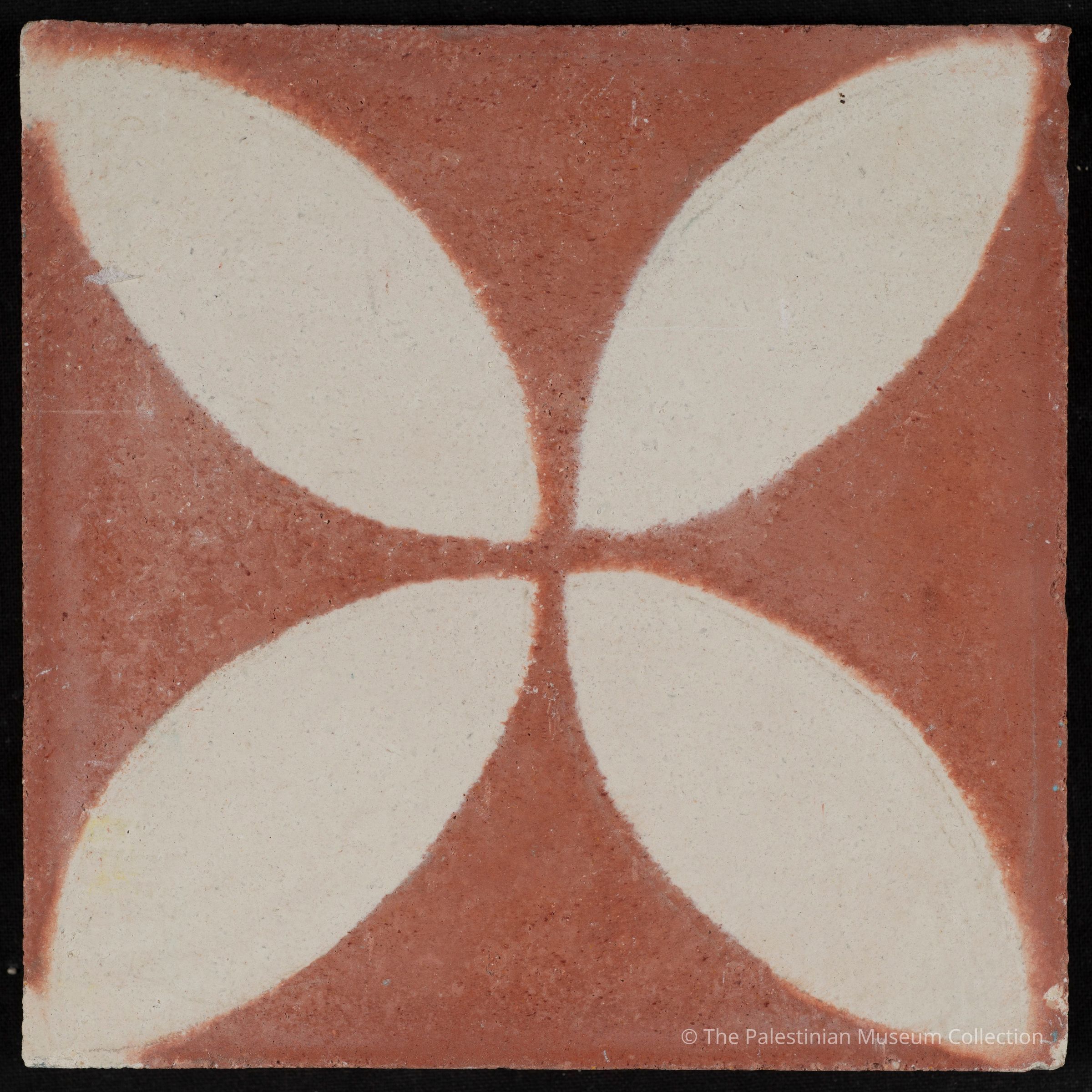A 20 × 20 cm coloured cement tile featuring the "Pigeon Egg" design. This tile is a contemporary reproduction, cast using an original mold from the Aslan Tile Factory in Nablus, and it was used about 10 years ago upon the request of one of the factory's customers.Made/Created