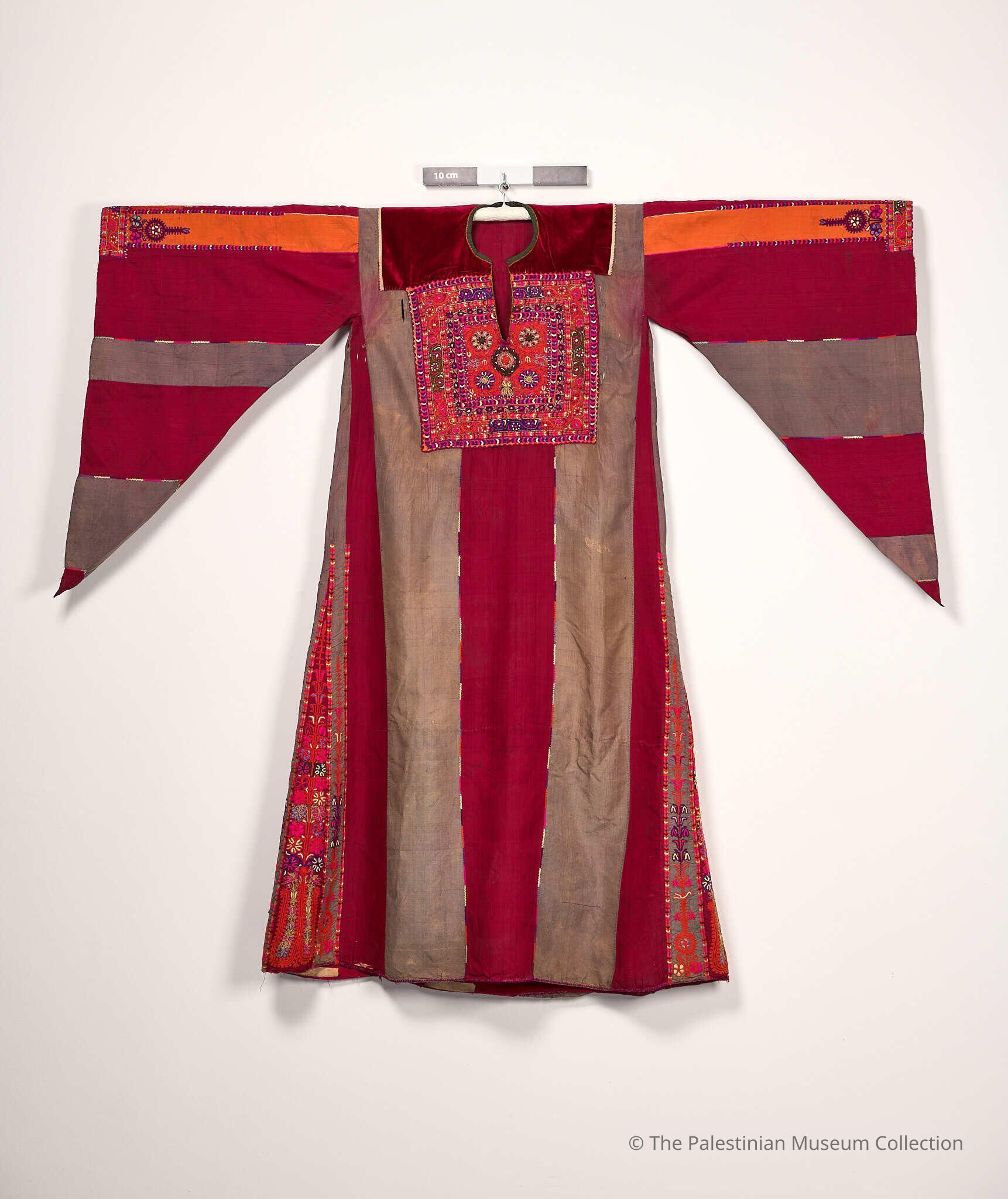 A wedding thobe (dress) from the Jerusalem and Bethlehem area. Also known as the Abu Qutba or Janna wa Nar (Heaven and Hell) thobe, it is made of red velvet and grey, red, and orange linen, and embroidered with silk threads in red, blue, yellow, and silver qasab (metallic couching cord). The chest panel of the thobe was made of silk and embroidered with a Tahriri (couching) stitch in plant shapes like roses. As for the shoulders and the burgundy velvet back panel (the upper back neckline) bear no embroidery. The shoulders are mradan (long triangular sleeves) with a tatreez (embroidery) of manajil (sickles) and watch motifs in red and yellow, and part of the sleeves is made of orange and red silk taffeta (heremzi). The front panel of the thobe is embroidered of manajil, whereas the back panel has no tatreez. The sides (al-Banayiq) are embroidered with manajil and watch motif along with various plant shapes.Made/Created