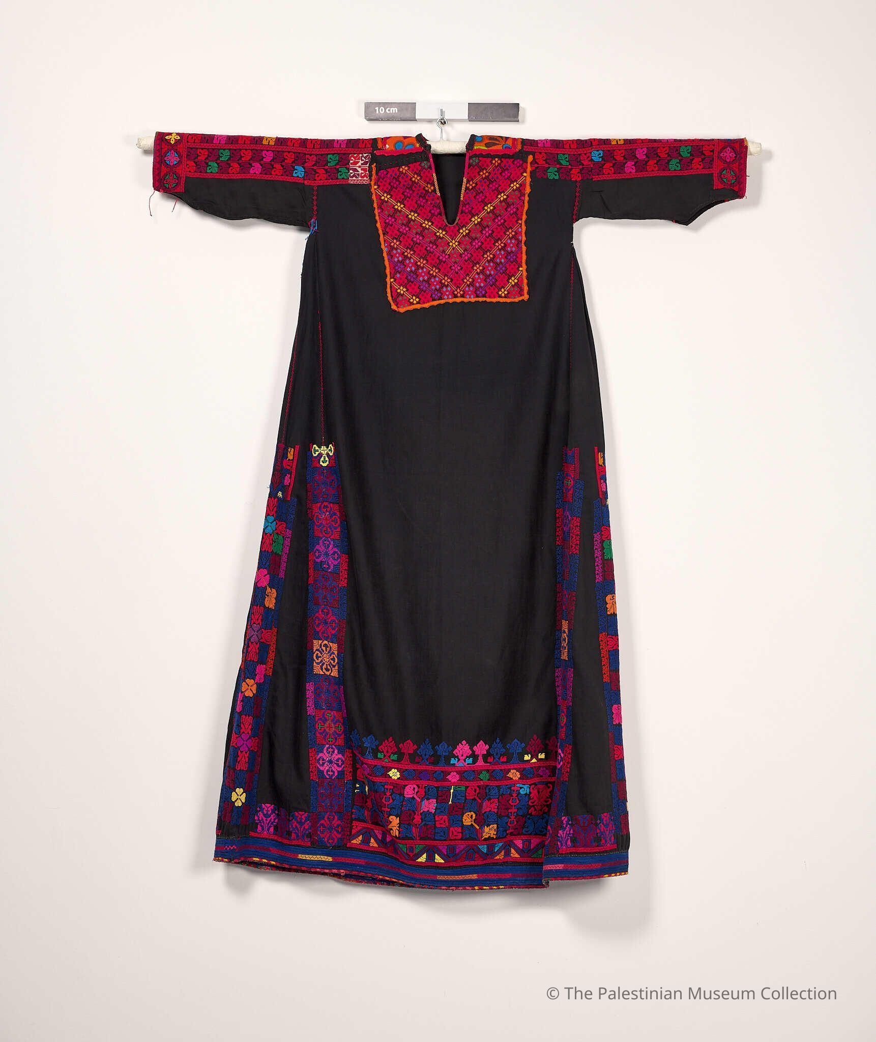 A thobe (dress) from Bir Saba’. It is made of black cotton and embroidered with primarily red and navy silk threads. The chest panel of the thobe is embroidered with predominantly red geometric and plant shapes and Tashrifi knots. As for the Nayashin (medal), they have a tatreez (embroidery) of plant and geometric shapes, while the back of the chest panel (the upper back neckline) is made of orange silk (heremzi) adorned with plant shapes. The sleeves have a tatreez of geometric and plant shapes, whereas the cuffs have a tatreez of geometric shapes. The front panel of the thobe has a light tatreez of rose and rose pots motifs along with plant and geometric shapes. As for the back panel, it has a heavy tatreez of rose, rose pots, and cypress motifs and plant and geometric shapes. The sides (al-Banayiq) are densely embroidered with rose, rose pots, and Pasha’s tent motifs. Additionally, the tail of the thobe is embroidered using a Tihshaya (couching) filling stitch, the stitch type used in all thobes from the Bir Saba’ area.Made/Created