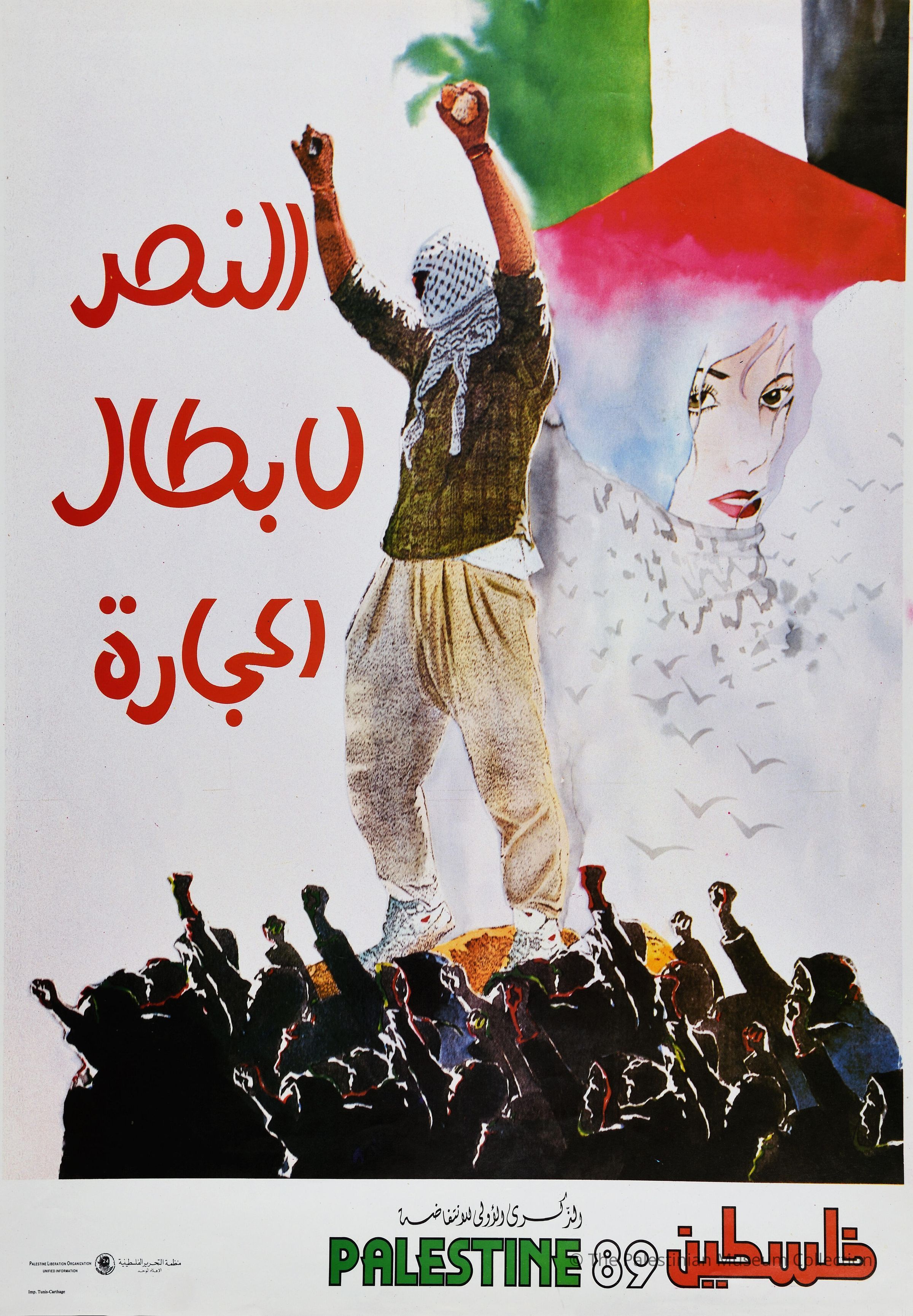 ملصق ملون، يظهر فيه أشاص في مظاهرةيرفعون أيديهم عالياً، في الوسط رجل ملثم بالكوفية يقف على صخرة يرفع يديه عالياً حاملاً الحجارة، في الخلفية فتاة ترتدي الكوفية فوقها علم فلسطين.