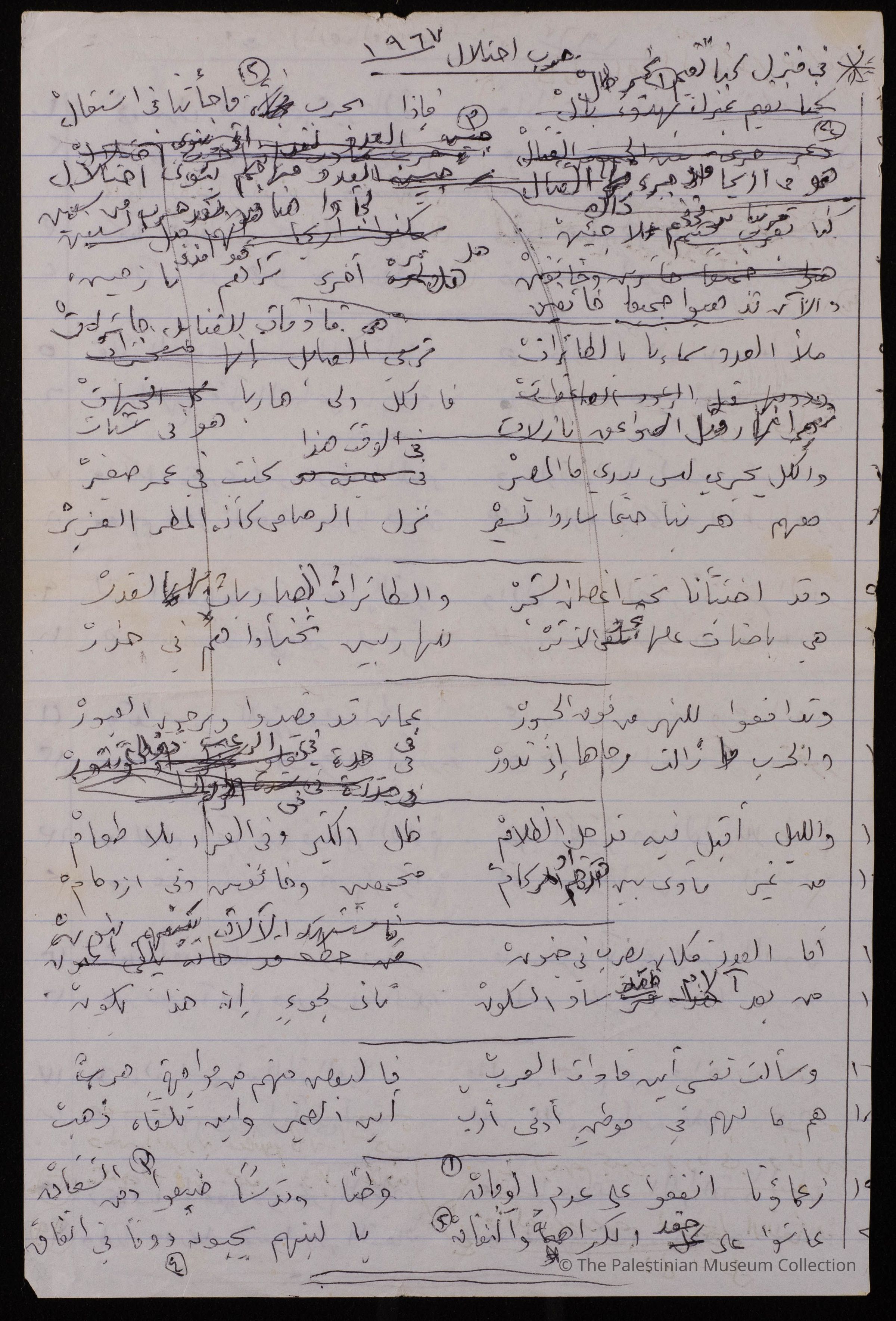 مخطوطة قصيدة باللغة العربية بعنوان " احتلال الضفة الغربية1967" للشاعرة فاطمة المحب ، ولا تحمل الوثيقة اية اشارة الى تاريخ كتابتها.