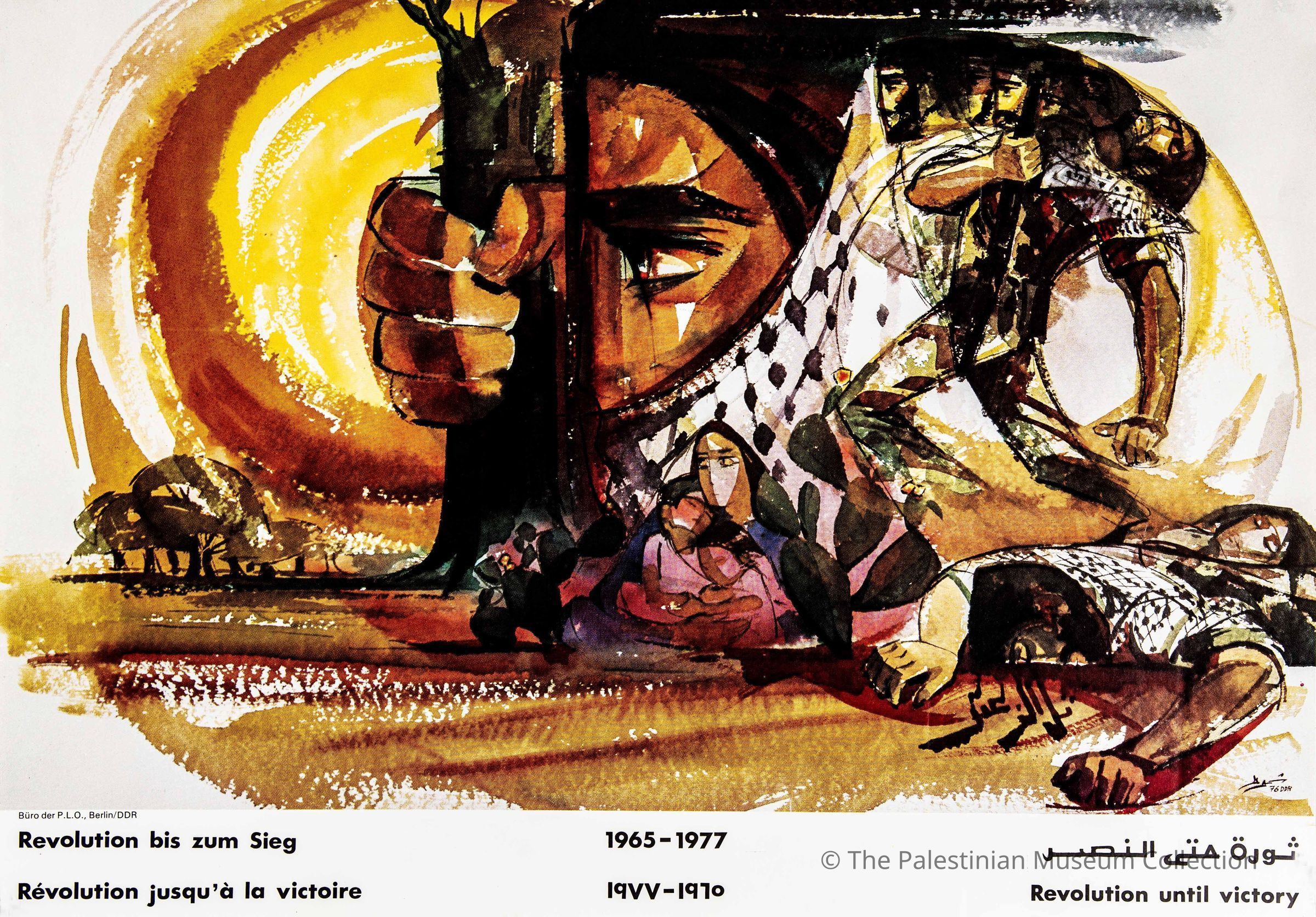 A poster entitled 'Revolution until victory' issued by the Palestine Liberation Organisation (PLO) Bureau in Berlin in 1977. It features 1976 artwork by the artist Ismail Shammout of the Tal al-Za'atar Massacre. The phrase at the bottom of the poster was translated into English, French, and German. The poster was dedicated to the German Democratic Republic in 1977.Dimensions
