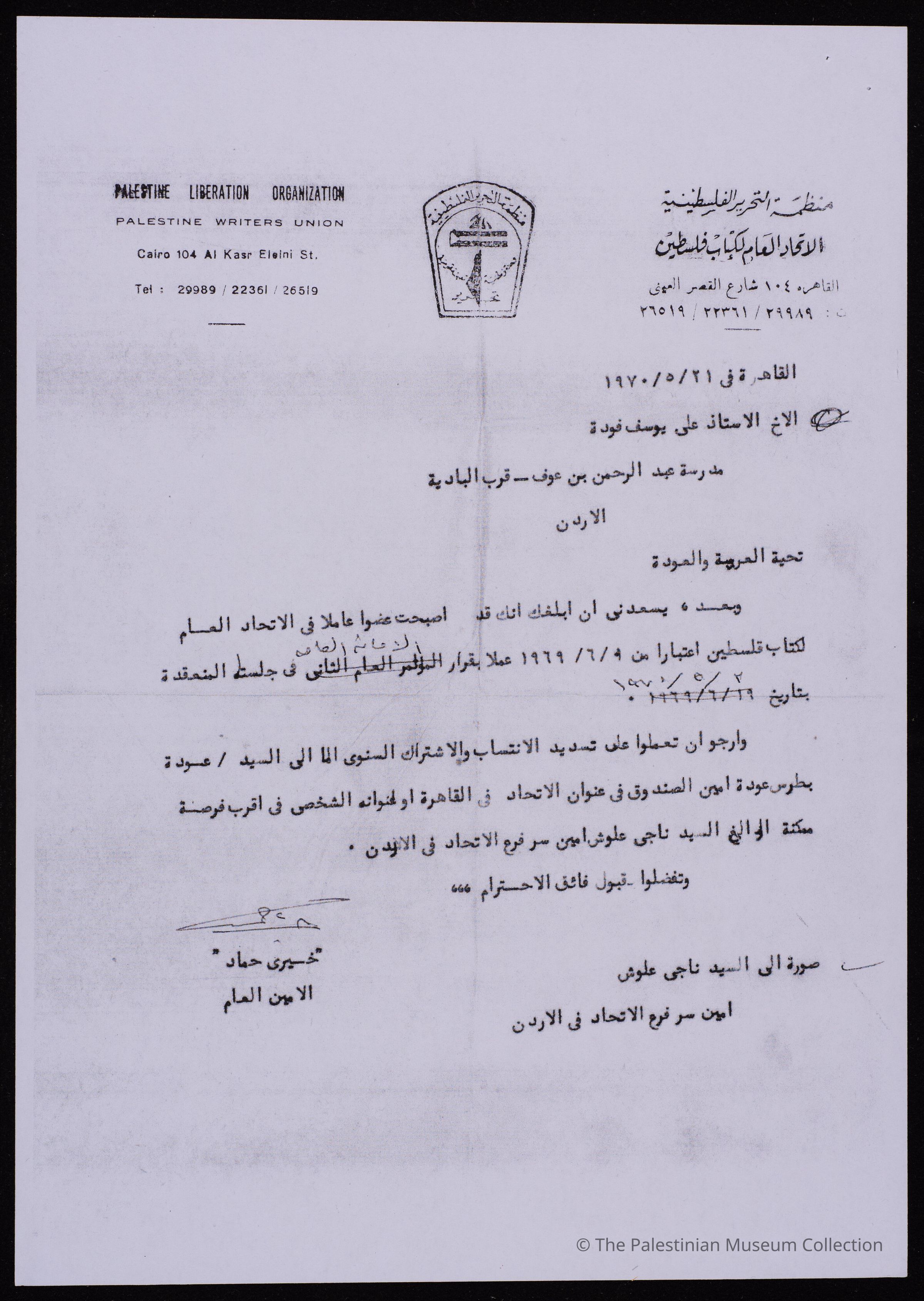 اثبات عضوية علي فودة في الاتحاد العام لكتاب فلسطينEntry/Object ID