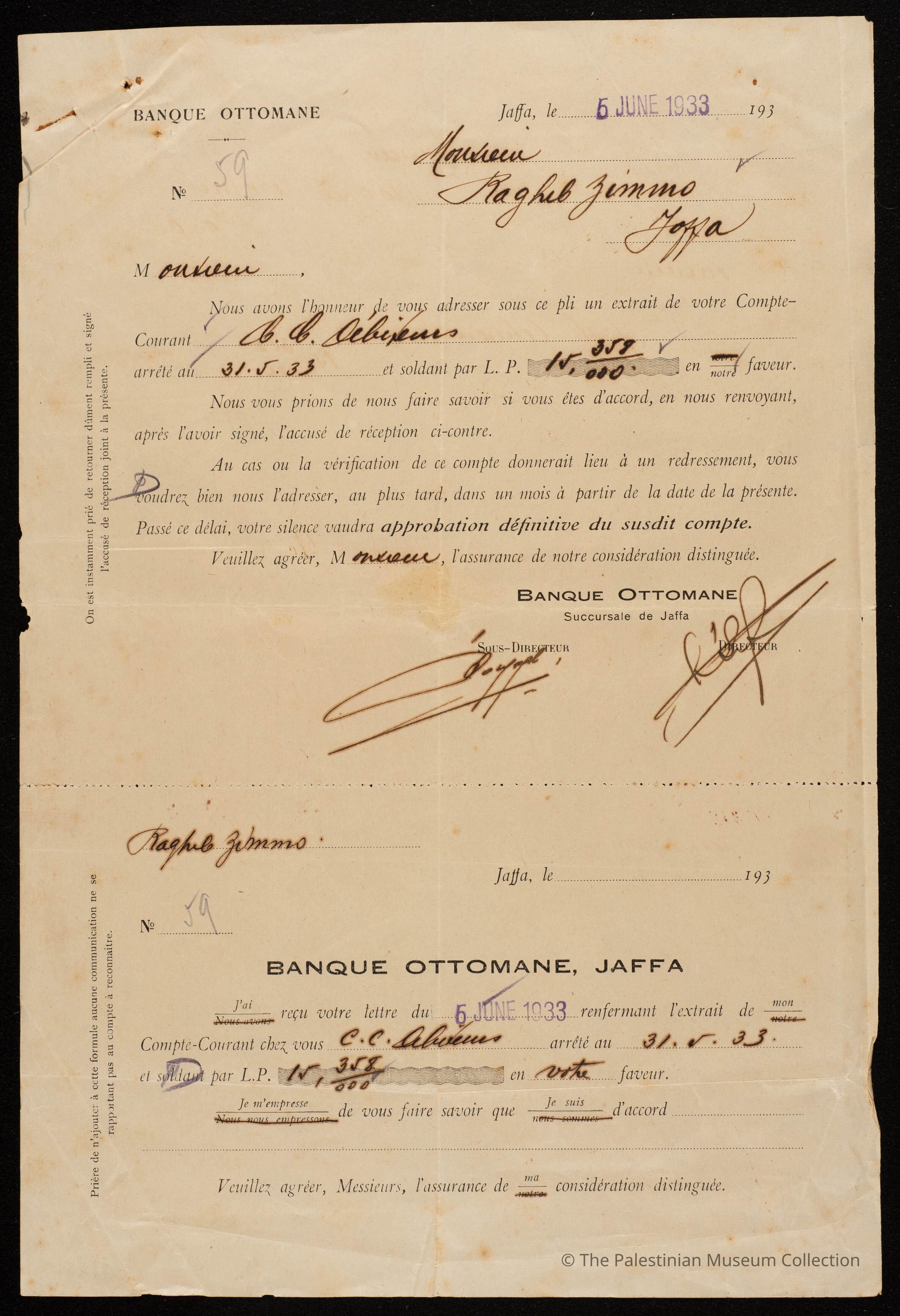 وثقية رسمية صدارة عن البنك العثماني بتاريخ 1933. موجهة إلى السيد راغب زمو وتحتوي على كشف حسابه. كُتبت الوثيقة باللغة الفرنسية.