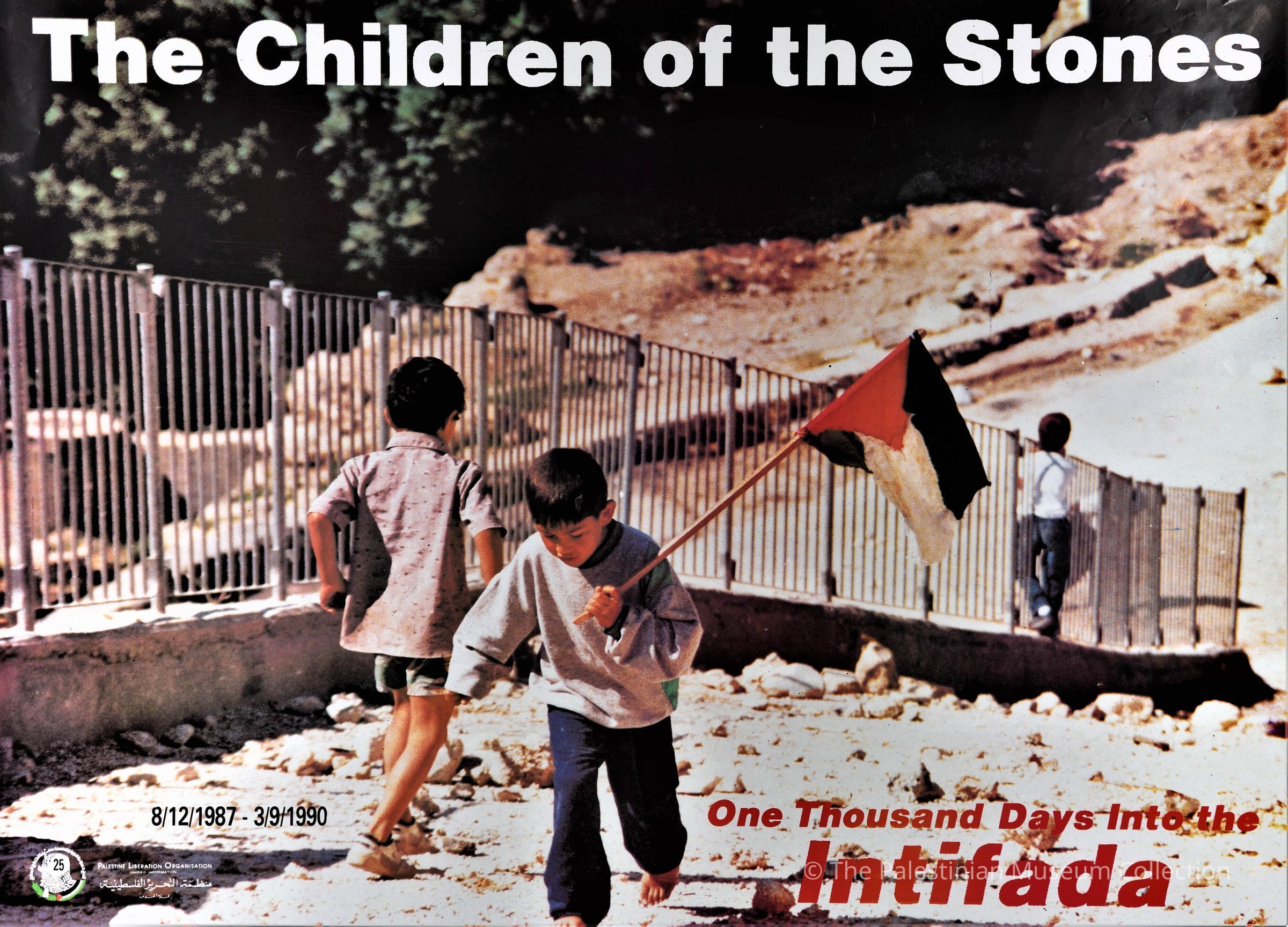 A colour poster showing three children running amidst ruins; one of them holding the Palestinian flag.Dimensions