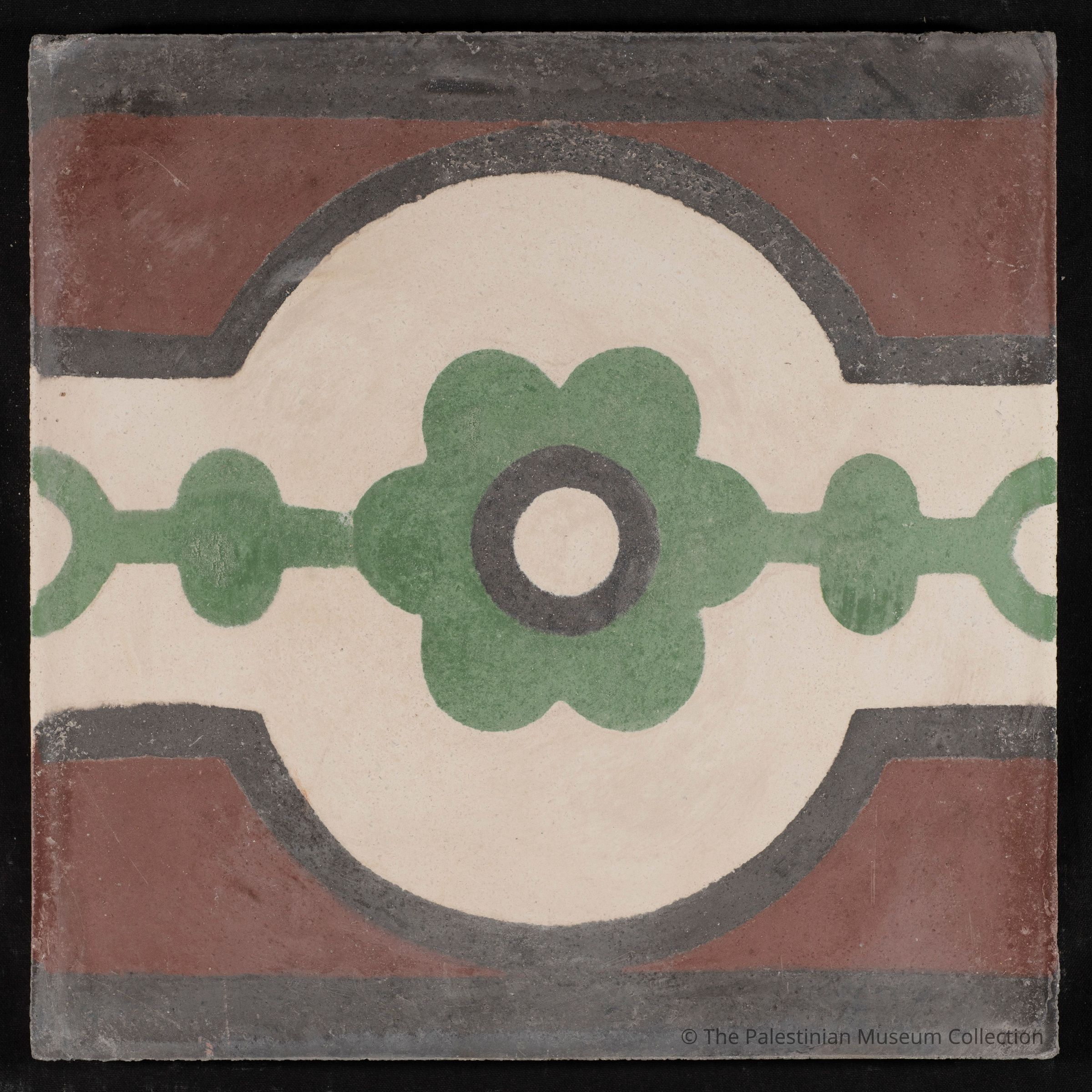 A 20 × 20 cm coloured cement Zunnar (border) tile. This tile is a contemporary reproduction, cast using an original mold from the Aslan Tile Factory in Nablus, which dates back to the 1920s.Made/Created