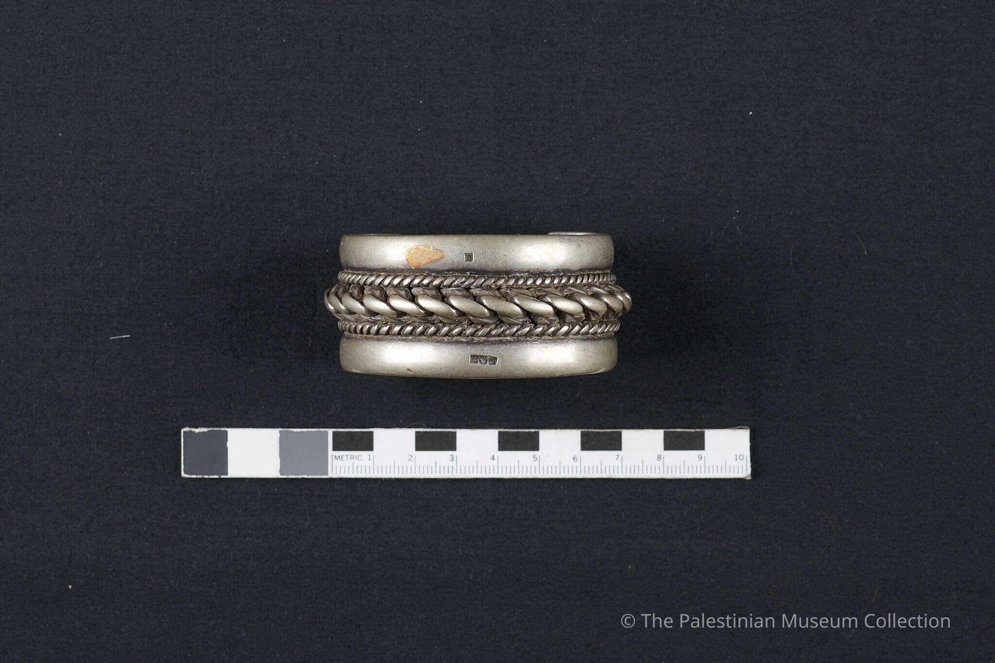 A broad handcrafted bracelet of high-calibre silver consisting of five parts, including two unengraved edges and three braided middle sections, two thin and one thick. The bracelet bears a stamp that determines the quality of silver. It was widespread in the Naqab desert, and its design was influenced by European braceletsMade/Created