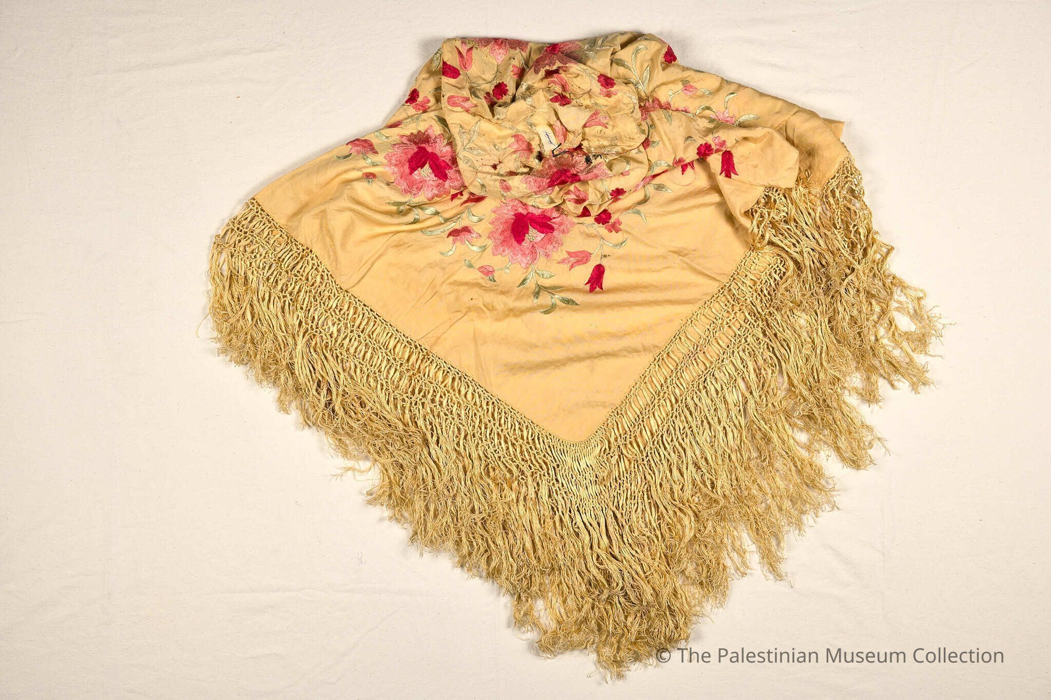 شال ياباني مصنوع من قماش القطن والكتّان البيج، شكله مربّع، ويُلبس على شكل مثلّث، وهو مُطرّز بورود بقطبة التحريرة، استخدمت فيها خيوط من الحرير ذات اللون الزهري والأصفر والأخضر، وفي نهايته شراشيب من كلّ الجهات.