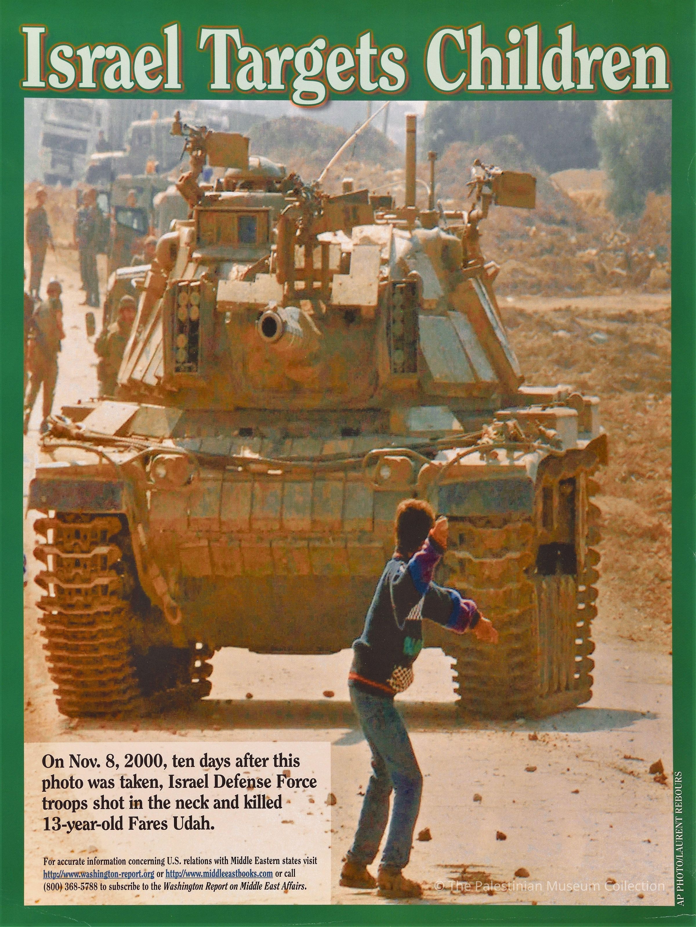 ملصق ملون يظهر فيه الفتى (فارس عودة) يرمي أحجاراًعلى دبابة للاحتلال في مدينة غزة. A colour poster showing "Fāres ʿaude" throwing stones on an Israeli tank in Gaza.