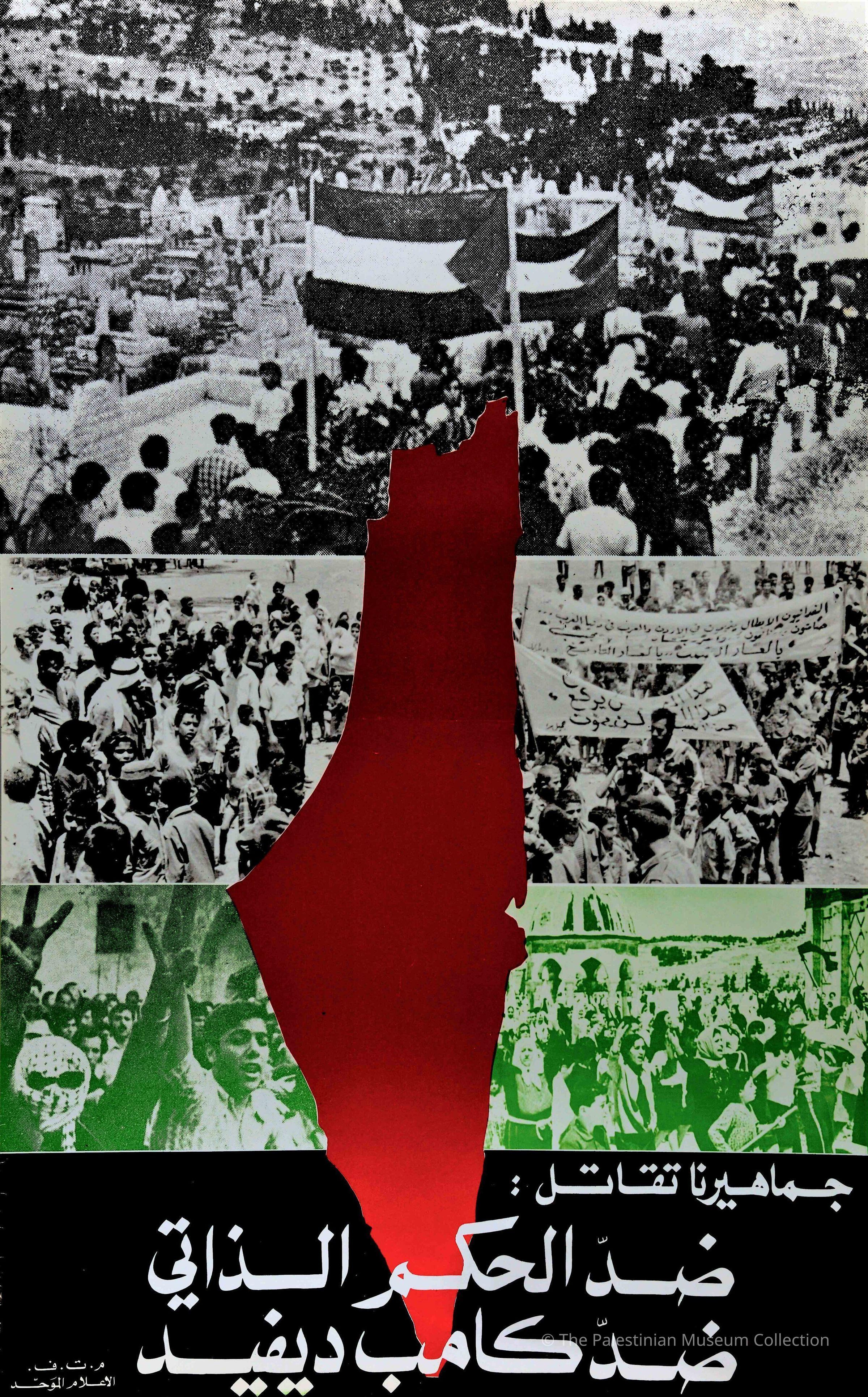 A colour poster showing photos of the Palestinian demonstrations against the Camp David Accords.Dimensions