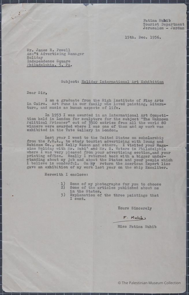 An official document written in English and issued by Fatima Muhib and addressed to Holiday Magazine in Philadelphia, regarding her participation in the Holiday International Art Exhibition.