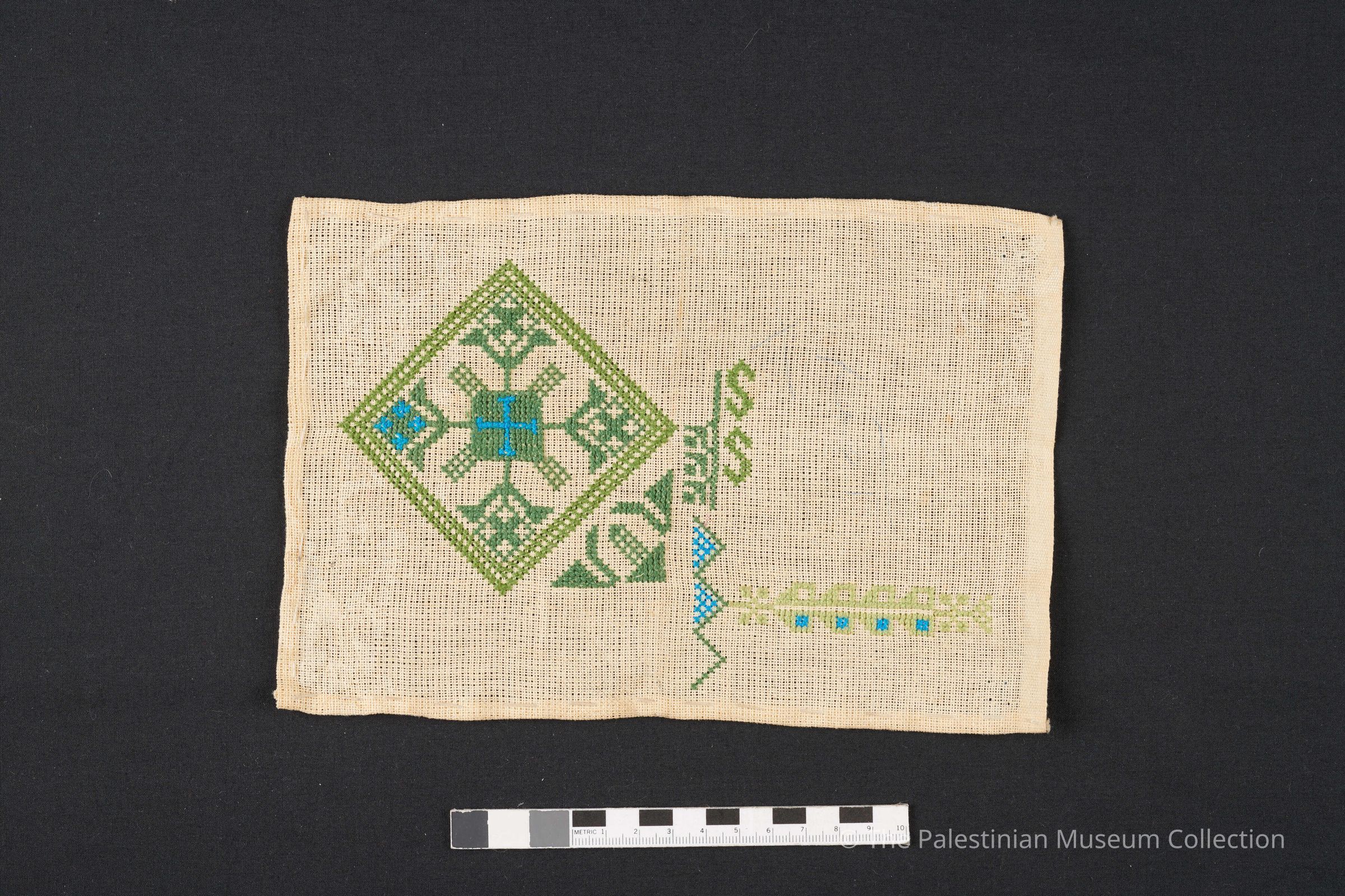 نموذج تطريز على قماش ايتامين بحرير لون اخضر درجتين وازرق برسمات متعددة منها الريش وحرف S